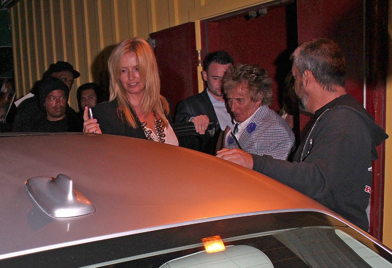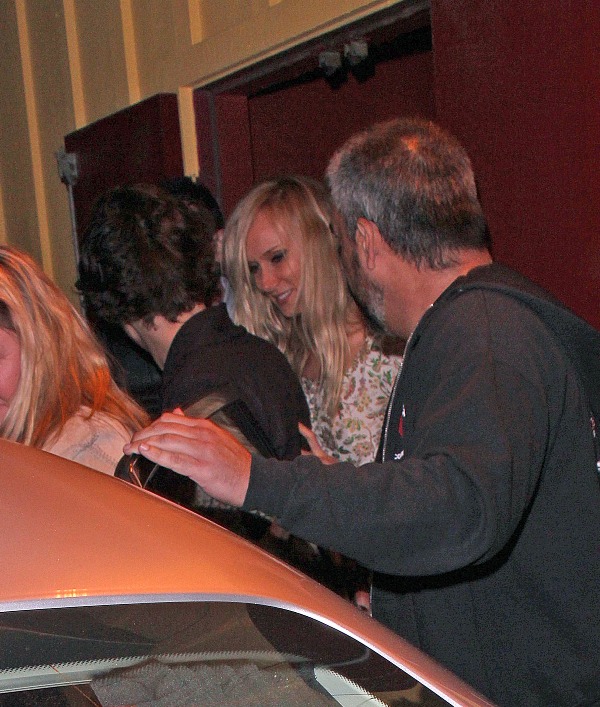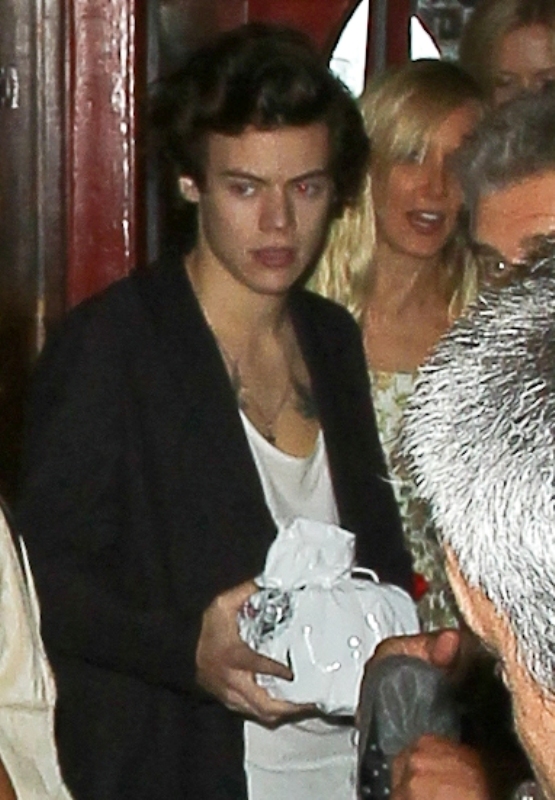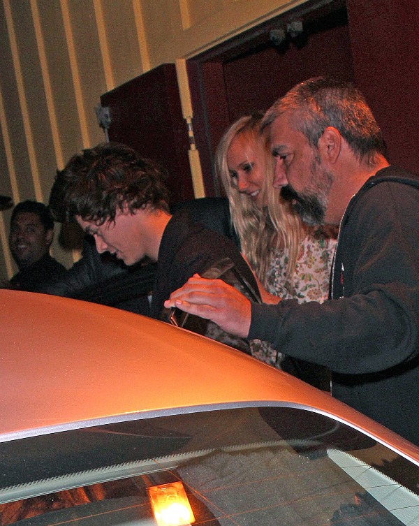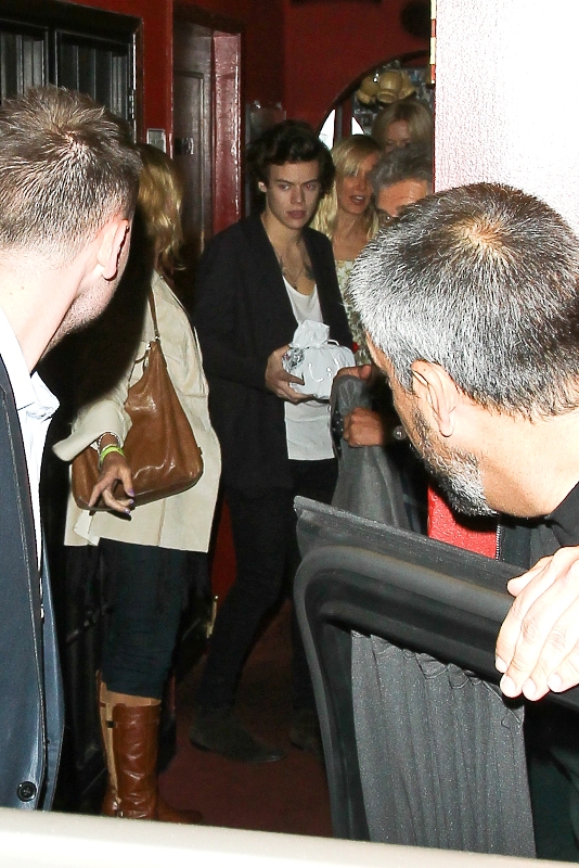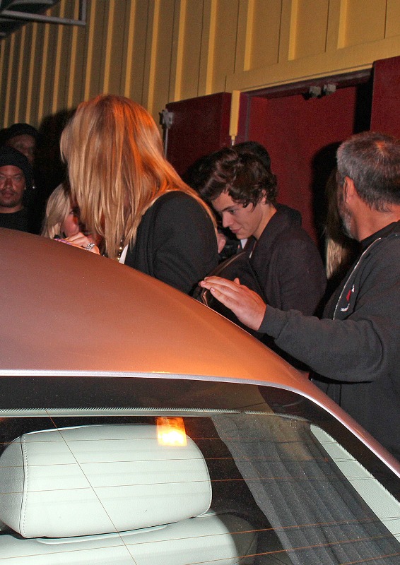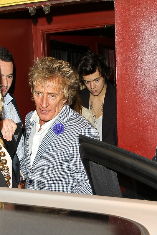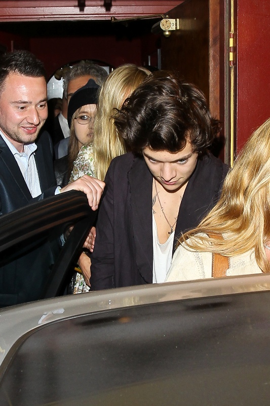 Harry Styles went for dinner with Rod Stewart and his wife Penny Lancaster yesterday in LA. Fine. But the photo agencies are saying that at some point, Harry was “reportedly seen kissing and holding hands” with Kimberly Stewart, 33, who gave birth to Benicio Del Toro’s baby Delilah last year. Where exactly this was reported is not cited. But Kimberly is there, I think. The one in the printed dress with the hair in her face, right?