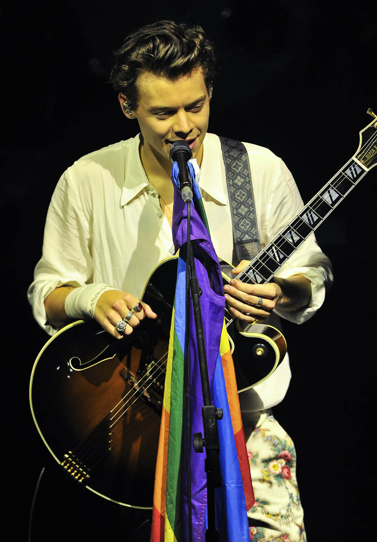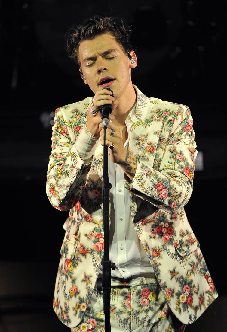 If, for nothing else, I want to see Harry in concert for the outfits alone. This blue floral suit looks incredible on him but I also think it would look pretty great on me. I want it. I don’t think I understand the floral pants but I’m still into them. Harry’s style (Ha!) is not the only thing people are talking about after his tour opener. At one point during the show, a fan threw a rainbow Pride flag onstage. Harry Styles proceeded to wave it proudly and attach it to his mic stand while he performed.