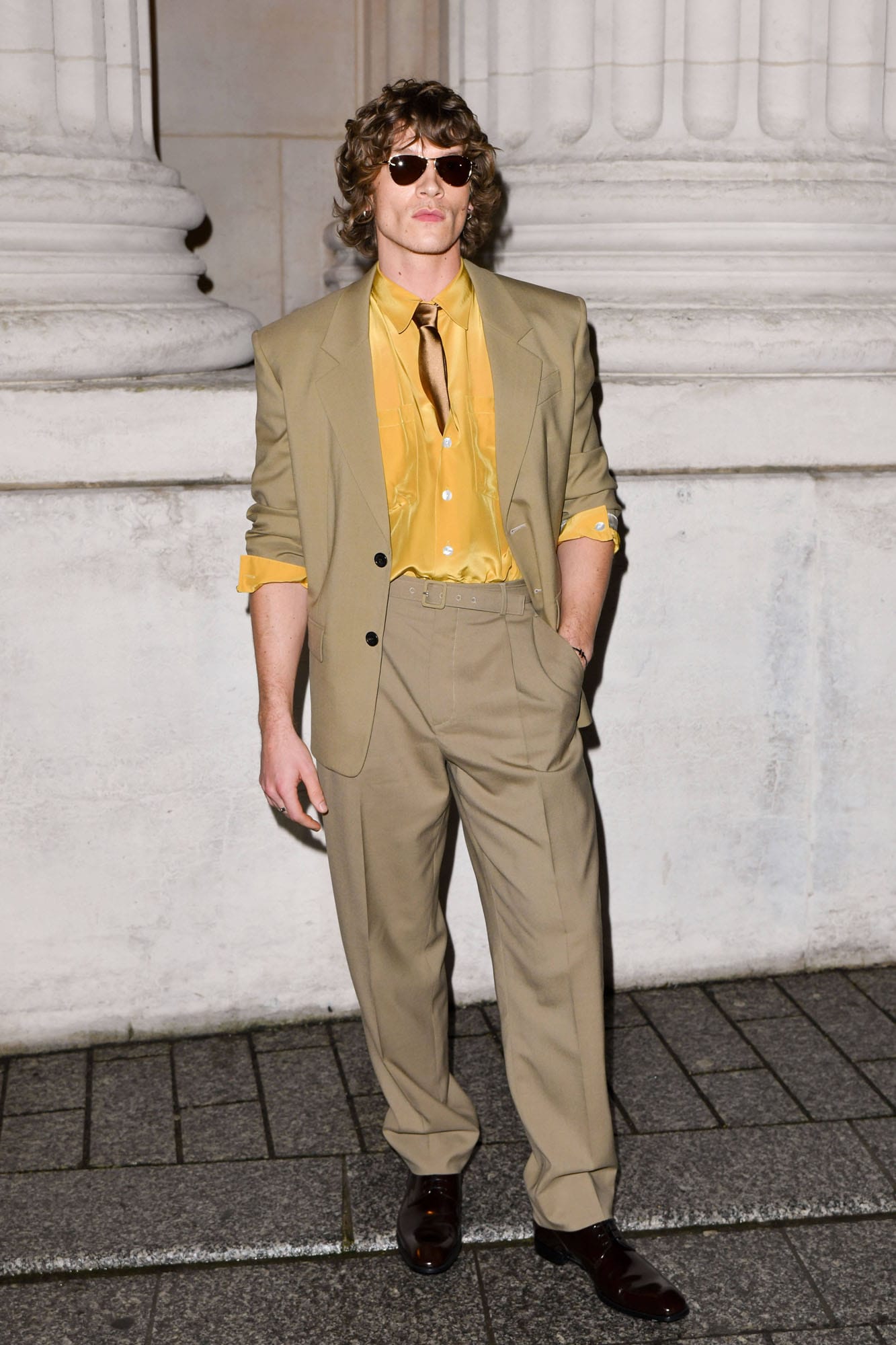 Connor Storrie was wearing Saint Laurent when he presented with Hudson Williams at the Golden Globes a few weeks ago. And he was in Paris last night at the Saint Laurent show. Wearing the f-ckingggg sh-tttt out of this tan suit and the yellow blouse and the sleeves rolled up with the bronze tie tucked in…