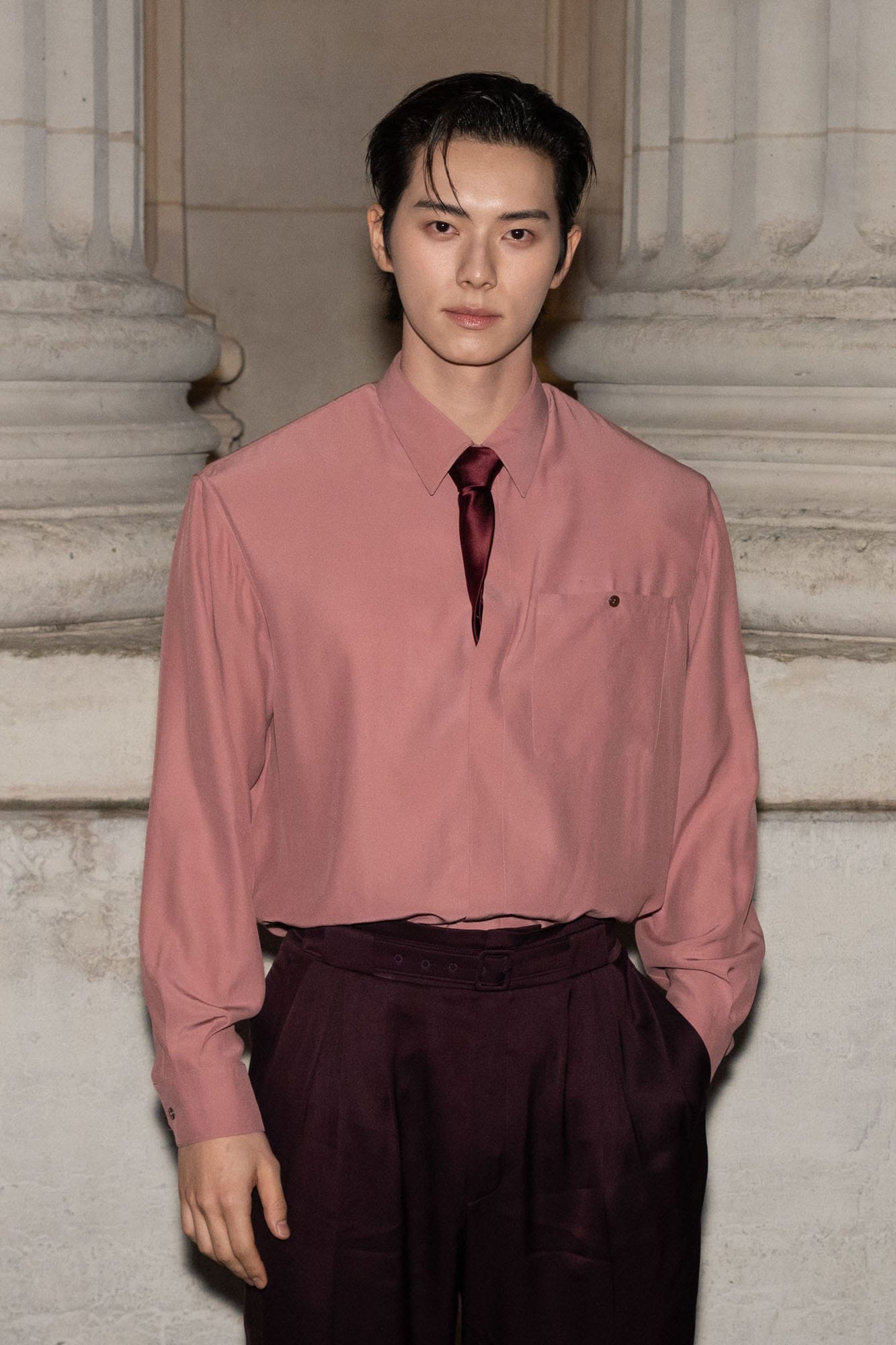 That’s how the ties were worn on the runway and on several of the celebrities – see also Lee Chae-min, in a dusty pink shirt with an oxblood tucked tie, and this is just too pretty.