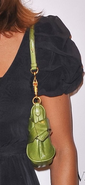 I suppose she was trying to bring out some of the colour in her skirt, or to brighten it all up, but the puke green is a terrible choice and worse still, it’s a really cheap looking one, a shade that requires caution because when applied improperly, the effect can be super low budget. Look at her. Does she look like a supermodel here with that designer knock-off market purse over her shoulder?