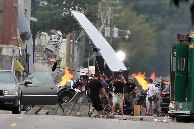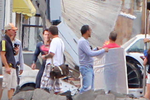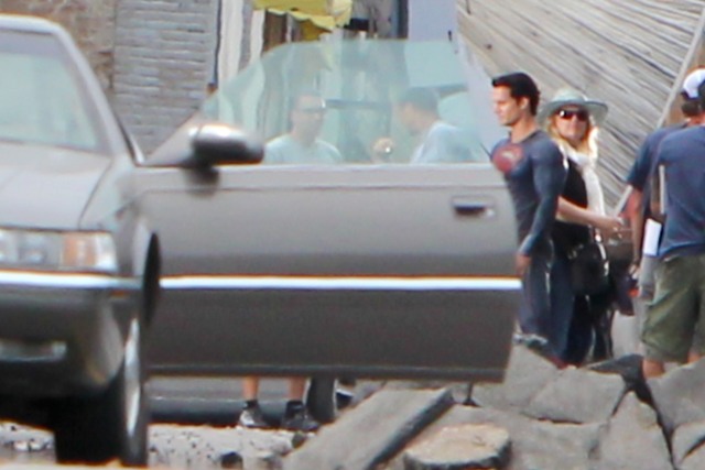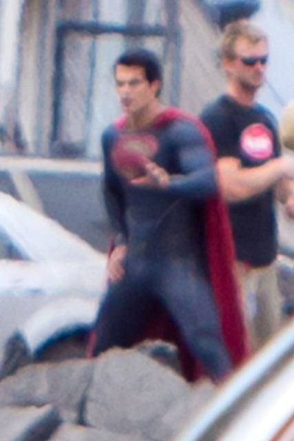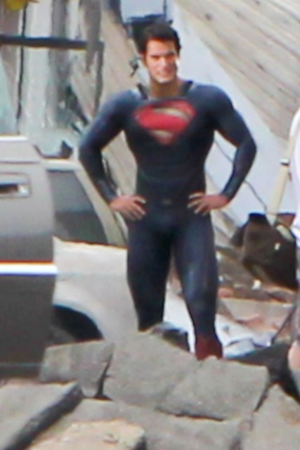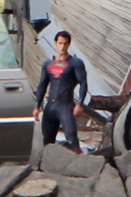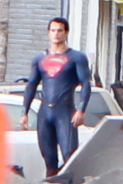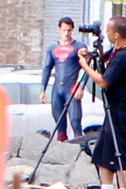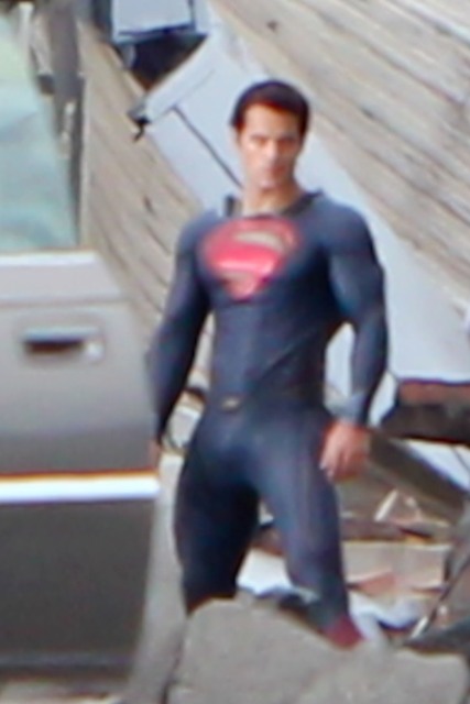 Last week we saw the red cape - click here for a refresher. Yesterday in Plano, Illinois, now being shot as Smallville, the suit revealed itself, and tightly, on the body of Henry Cavill.