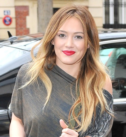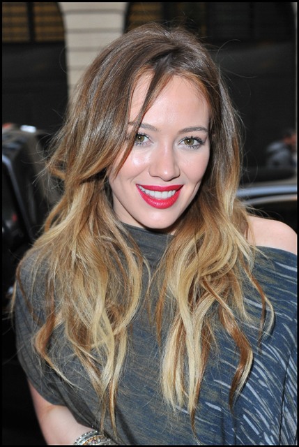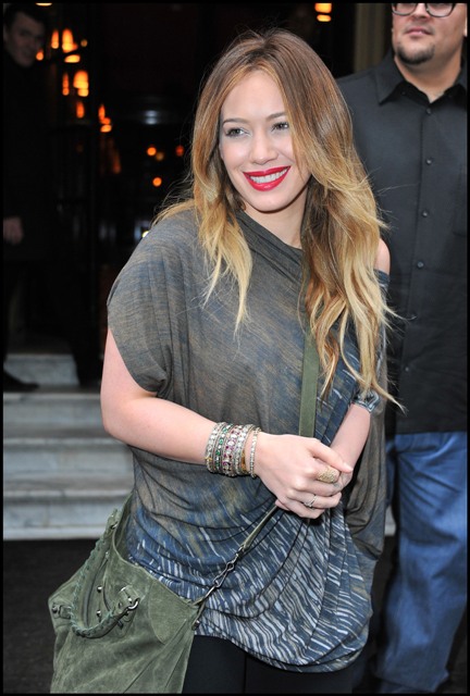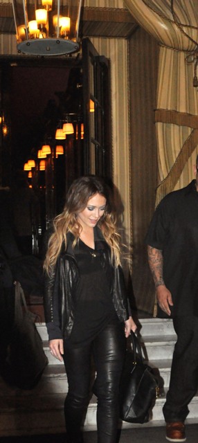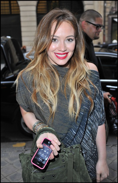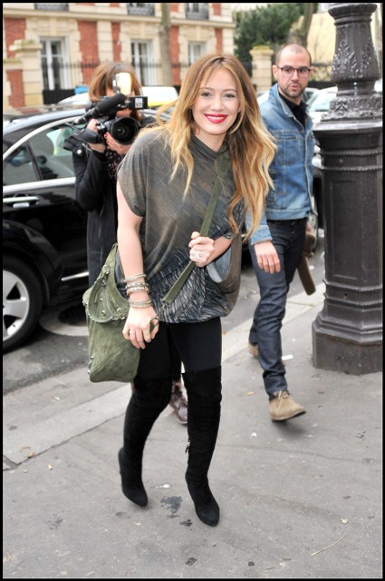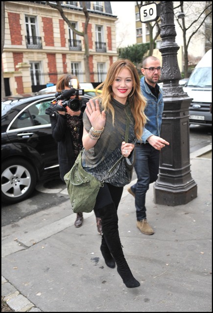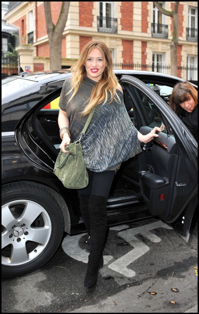This is Hilary Duff, kinda reminding me of Jennifer Lopez, leaving her hotel in Paris last night and also today arriving at a tv studio to promote her book Elixir.