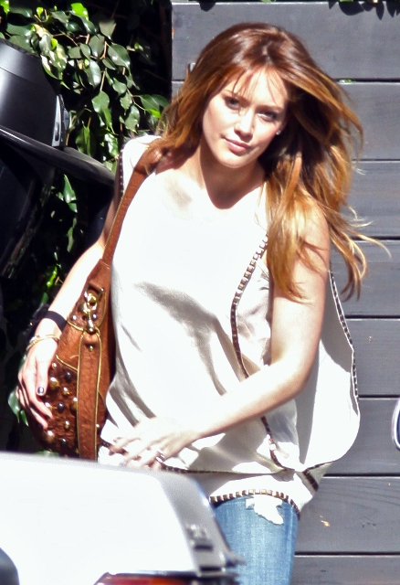 Attached – Hilary Duff leaving the hair salon yesterday.