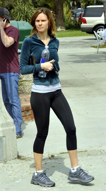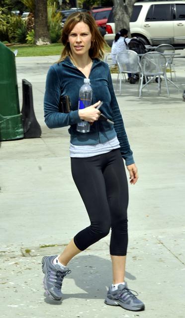 Here’s Hilary Swank on her way to the gym today in Santa Monica, fit as f-ck. She’s thin but she is toned. And she doesn’t look like she’s about to die from hunger. She looks like she eats chicken and steamed veg but she eats to train. That ass has been TRAINED.