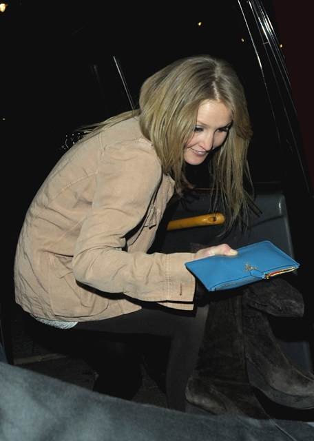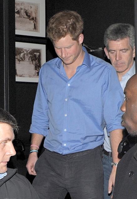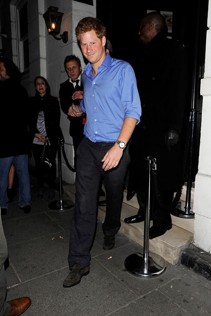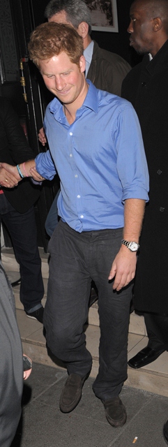 Hot Harry is back in London and hit up The Brompton Club last night. At some point during the evening he was talking to a blonde who was smoking in a stairwell. There’s a photo of her here (scroll down) that shows her leaving with her boots off. In other words, Drunk Girl. Or, more accurately, Rich Drunk Girl.