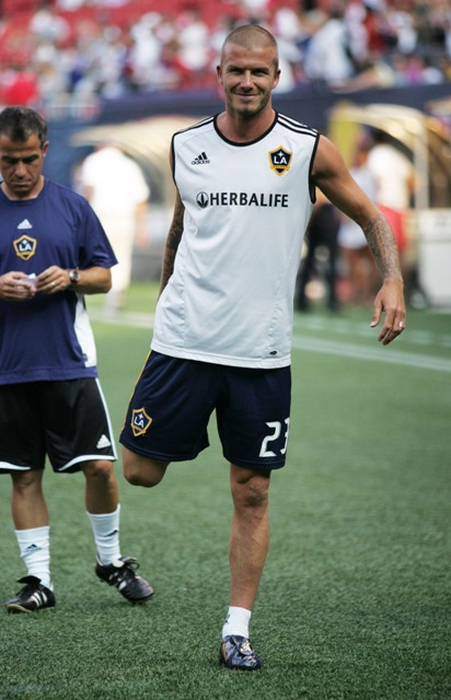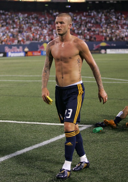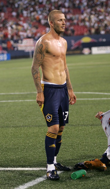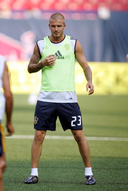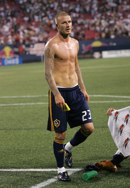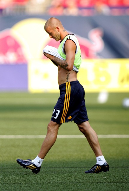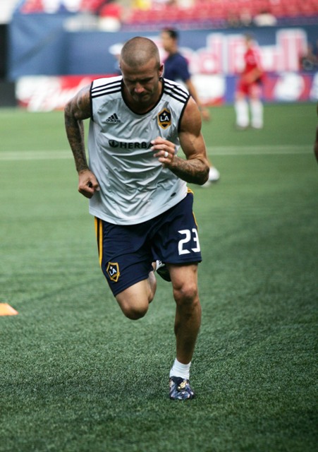 David Beckham and the LA Galaxy played the New York Red Bulls this weekend – here’s the hotness warming up before the game, quivering me with his crazy cut arms. And the side view of Becks is second to none. I like the abs/ass combination. The slight bulge from each end… amazing.