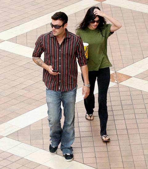 So it was all good a year ago when Megan was just another sexy looking tart groping Brian at an outdoor café – remember this? – but now that she’s making a big push, how much longer will this last? Here they are in Hollywood yesterday.