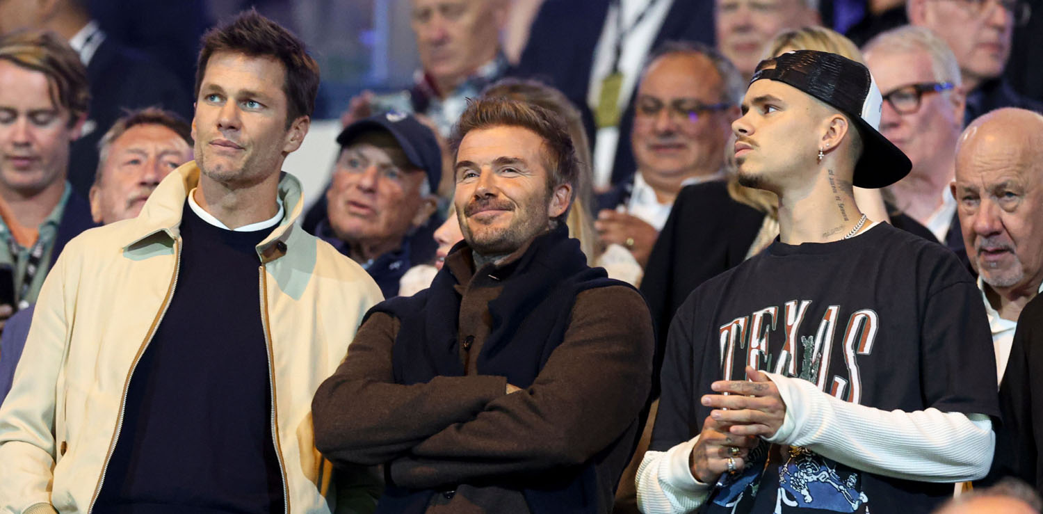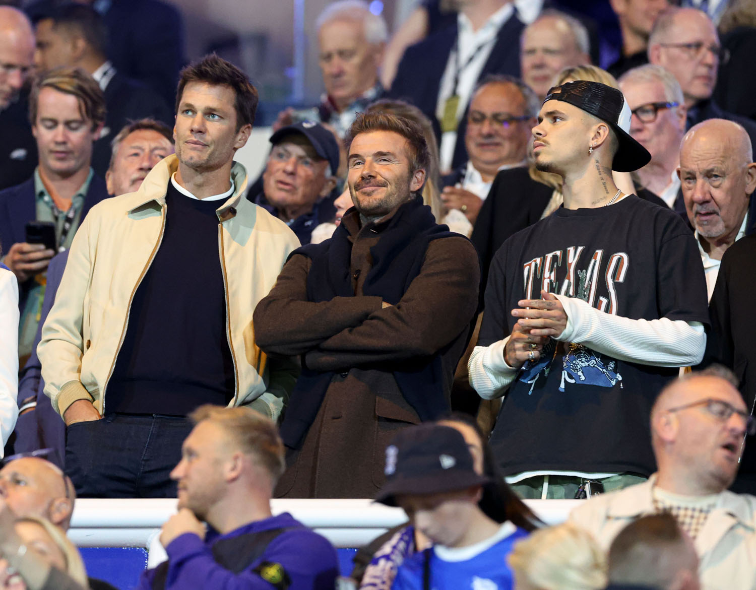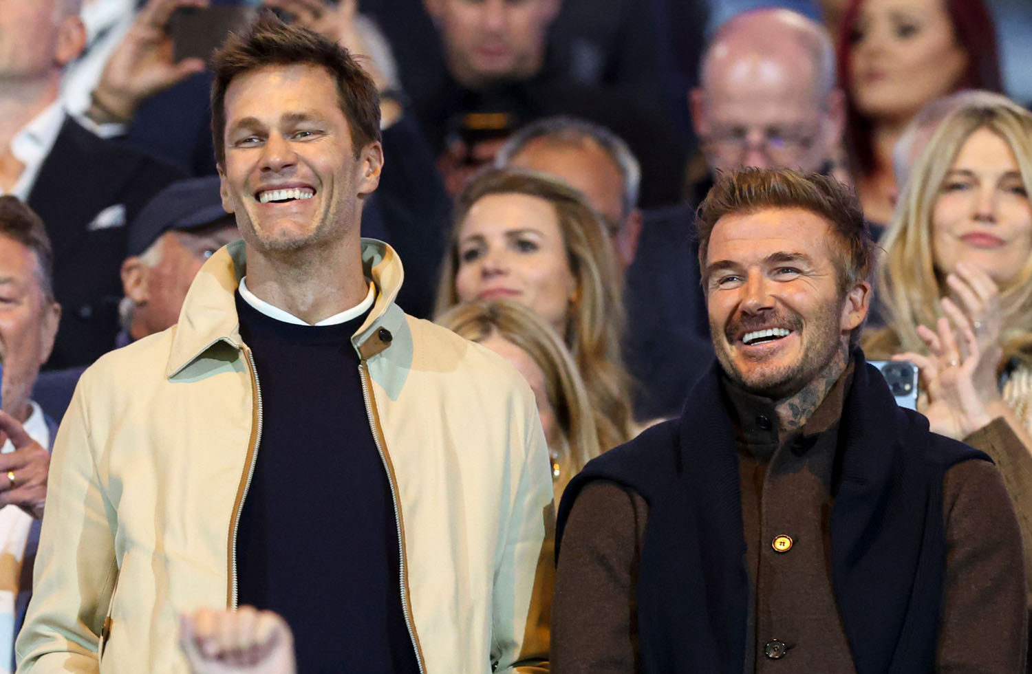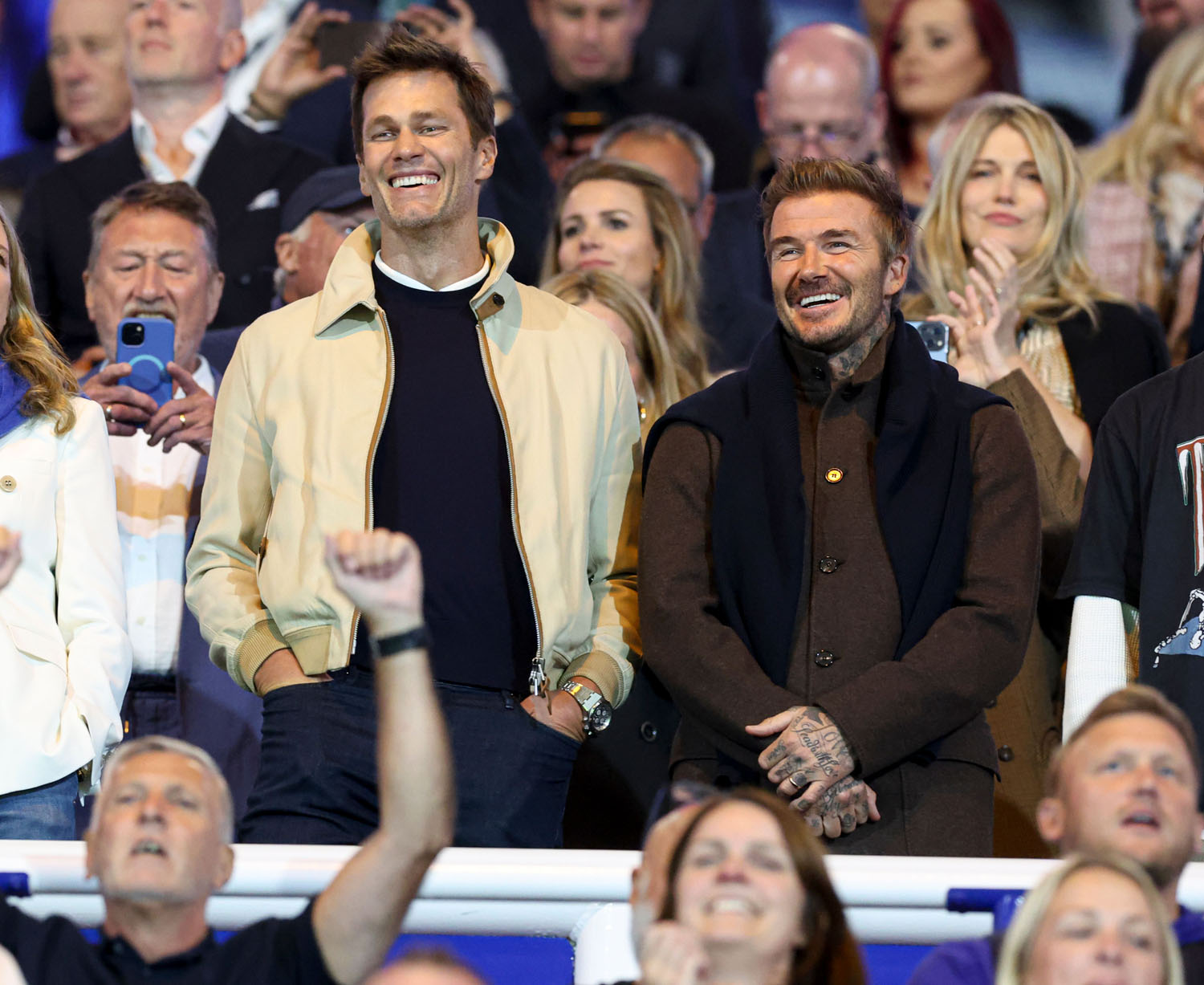 Here's David at a Birmingham City v Wrexham game yesterday with Tom Brady and son Romeo.
