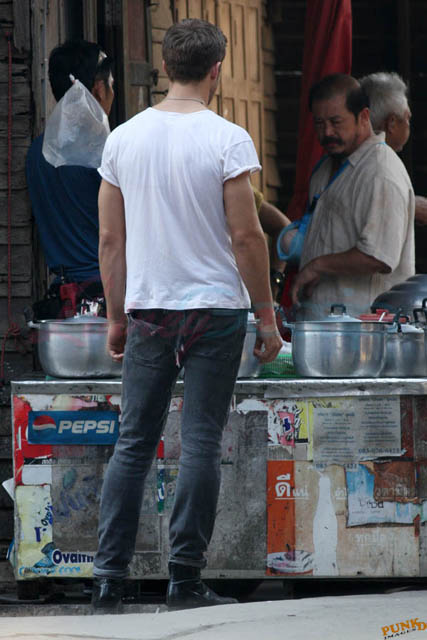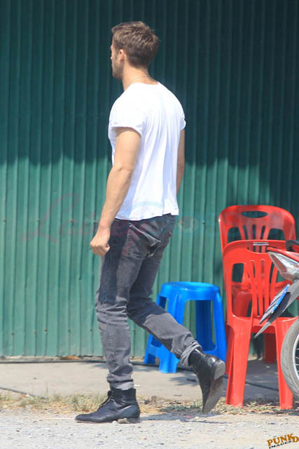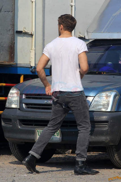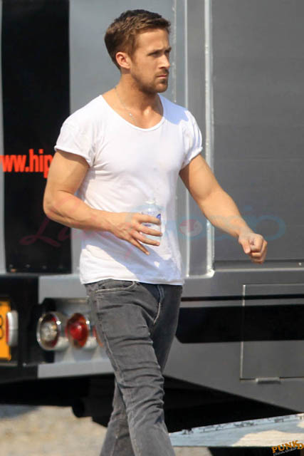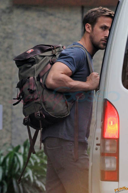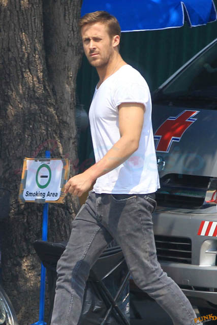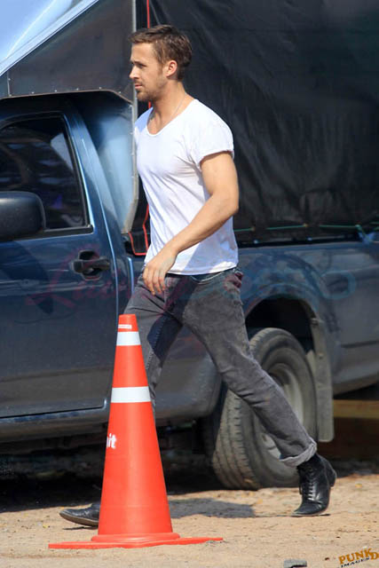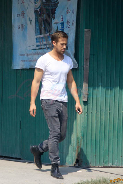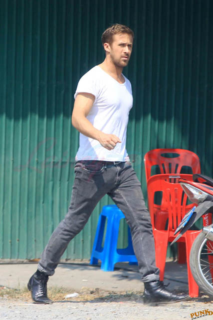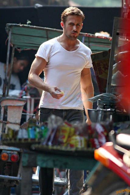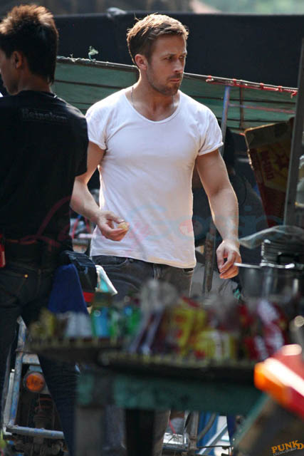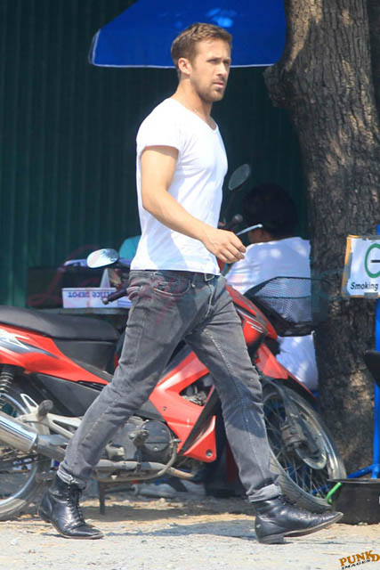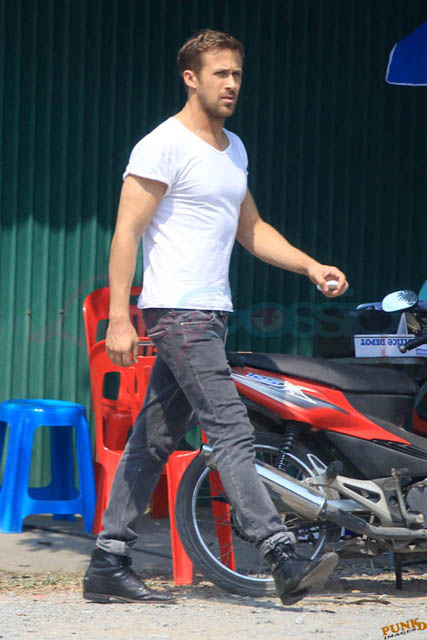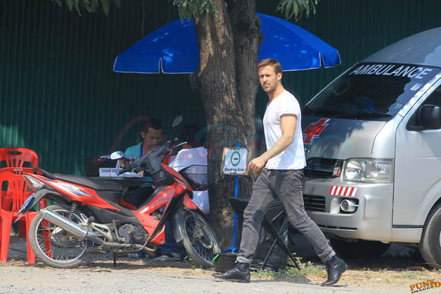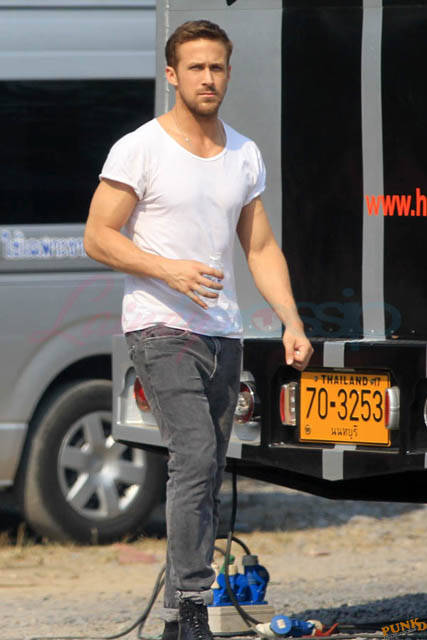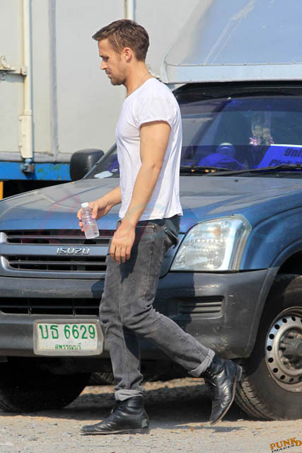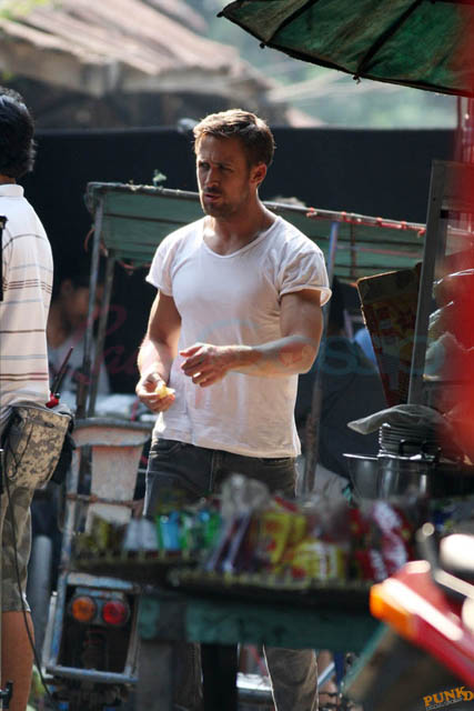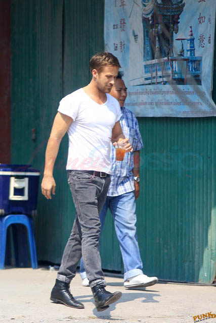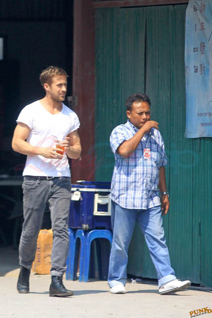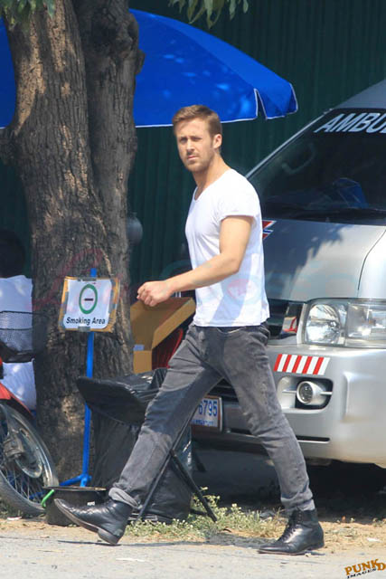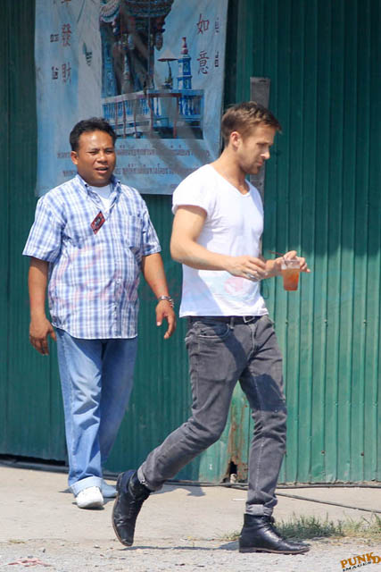 Check out these new photos of Ryan Gosling working on Only God Forgives in Thailand yesterday and his girlfriend Eva Mendes getting her hair blown out - double! Have you ever had a double??? - while he’s on set.
