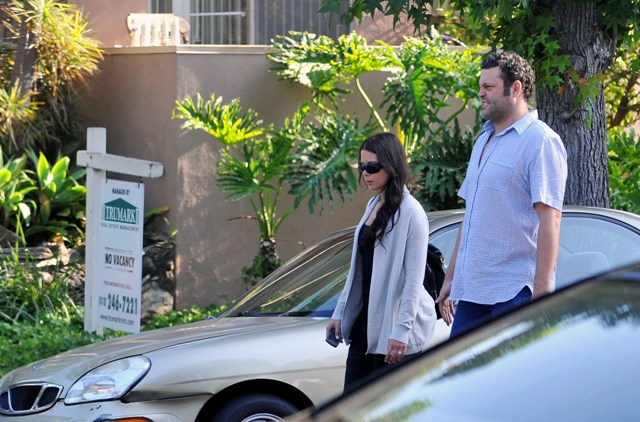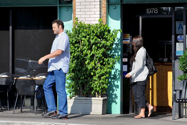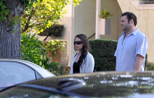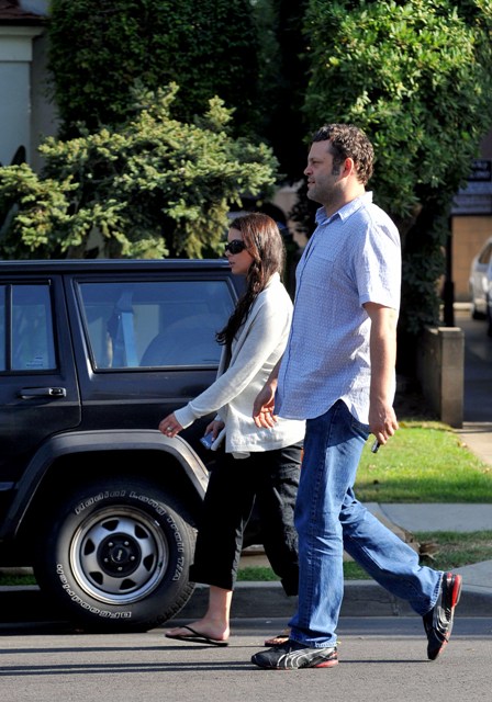 Photos of the Brange electrifying the red carpet last night with their hotness will be all over everywhere. And now these – of her ex boyfriend Vince Vaughn strolling around contentedly before dinner last night in Hollywood – well they won’t help either. Because he’s with his fiancee, a Canadian girl from Alberta called Kyla Weber.