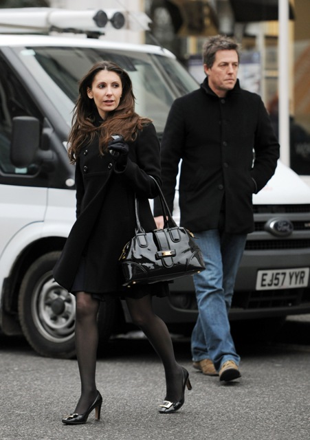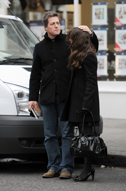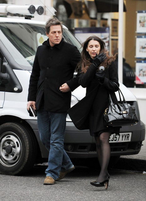 This is Hugh yesterday in London leaving a tapas bar after spending two and a half hours with this lovely lady. He seems tender with her, non? Touching her head, holding out his arm to her…and in his hand a book – Only Love Is Real: A Story of Soulmates Reunited by Dr Brian Weiss.