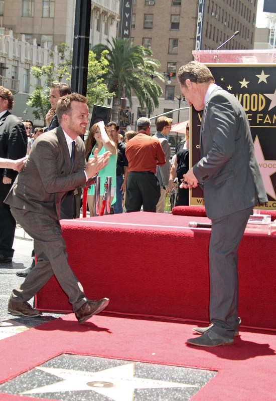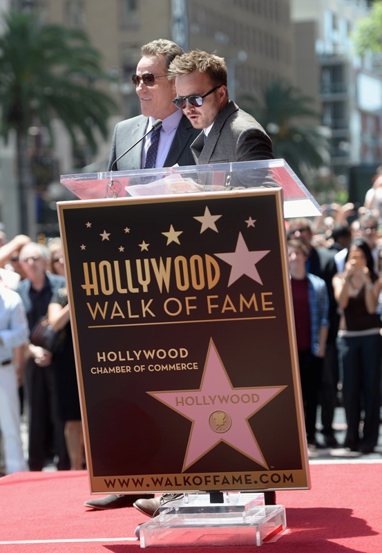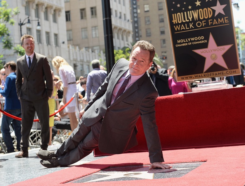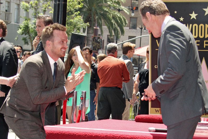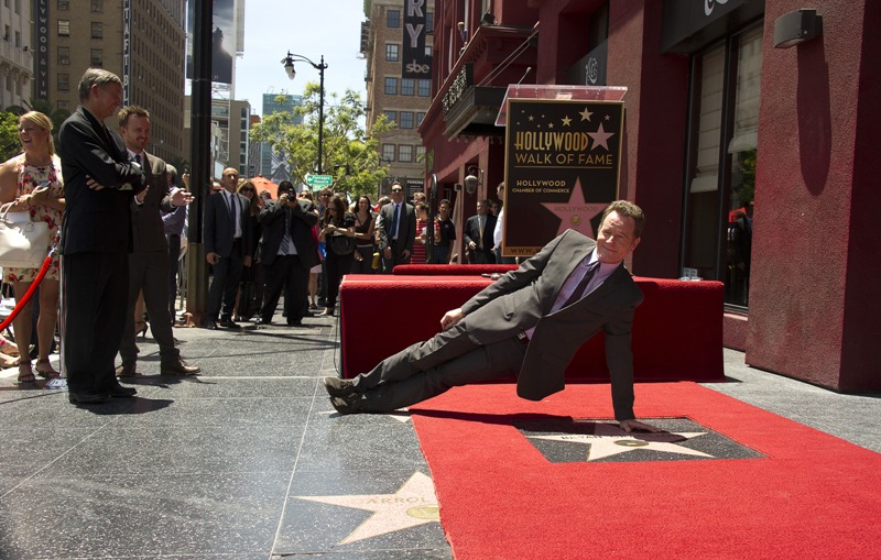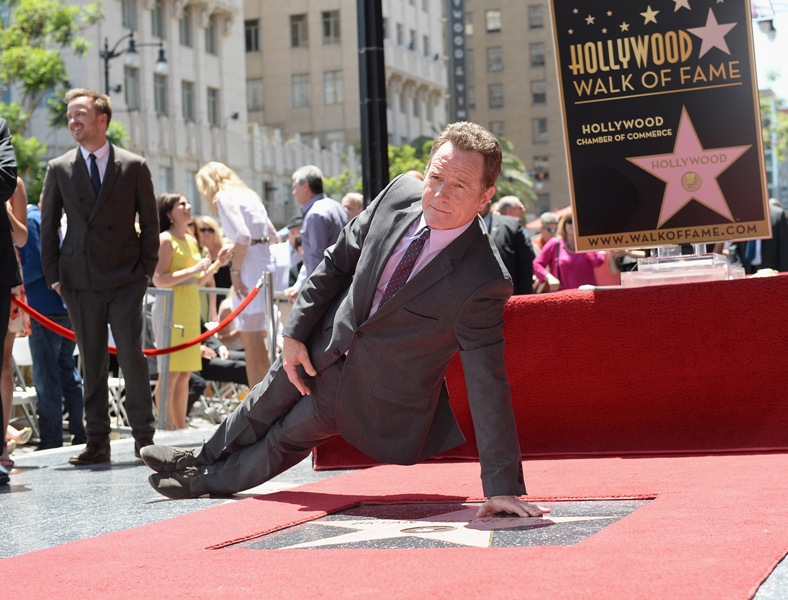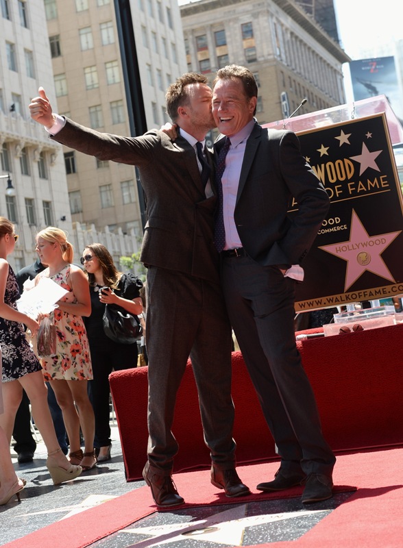 And here’s Bryan Cranston getting his star on the Walk of Fame, supported by his Breaking Bad costars Aaron Paul, who looks happier for Cranston than he would for himself, Anna Gunn, R.J. Mitte, and Bob Odenkirk. Breaking Bad resumes in a few weeks. Maria will be recapping again.