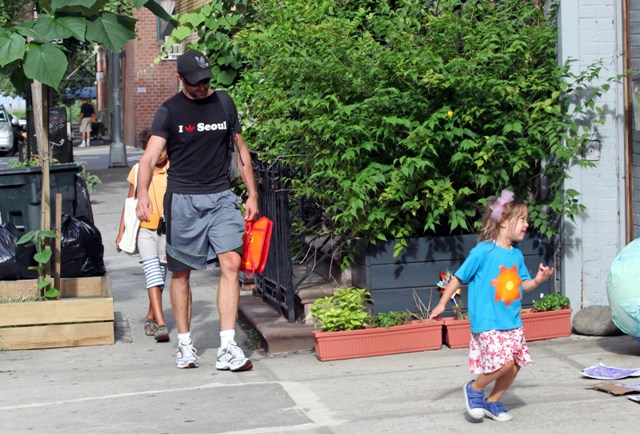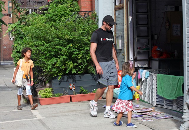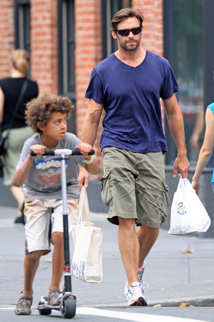 Hugh Jackman was photographed in NYC this weekend with his children Oscar and Ava. Hugh gets to stay close to family through the rest of summer and fall because he’ll be on Broadway with Daniel Craig in A Steady Rain, beginning previews on September 10th.