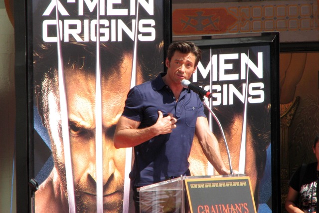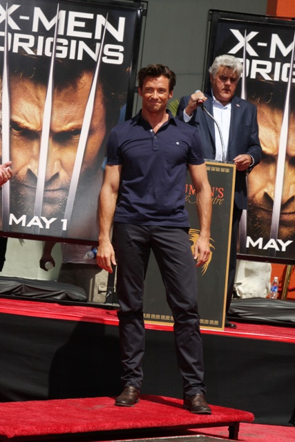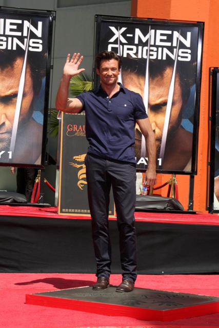 To make up for it, here are several shots of Hugh in Hollywood yesterday at his hand and footprint ceremony on all fours with his pipes all pumped and a big smile as usual working it for the crowd and the cameras.
