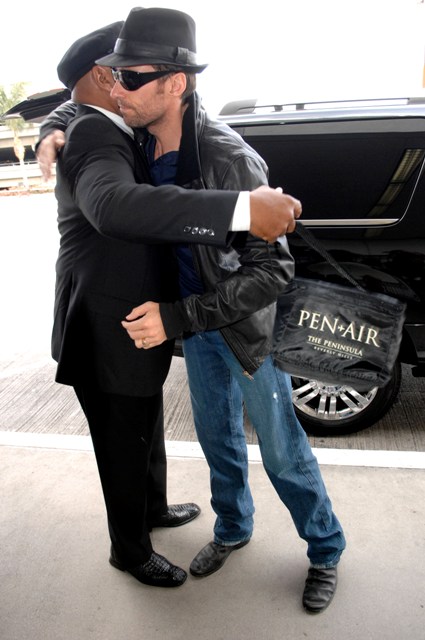 Finally, Hugh Jackman leaving LA this morning, hugging his driver, exchanging fist bumps, before flying away again, never stop go go go but always with a smile.