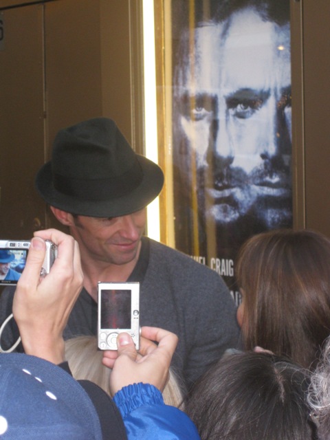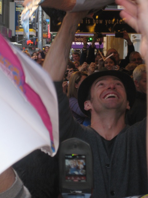 These two crazy girls came up from L.A. because they knew his birthday was the next day. They had made him a Wolverine pinata (can't imagine that was easy to get through airport security). Look at how pleased he was as he reached out to take it and how he took the time to call the two girls over to the side and actually talk to them, take pictures with them and the pinata. When he drove away and took the pinata with him (after taking a second to wave and acknowledge the crowds on both sides of the street), they nearly died.