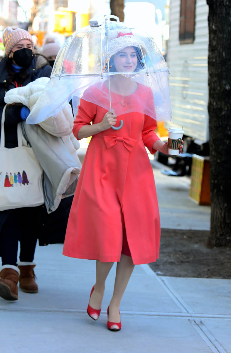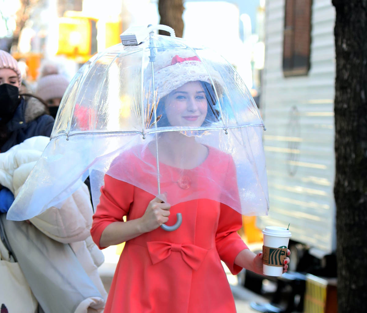 I am very, very into Rachel Brosnahan’s umbrella on the set of The Marvelous Mrs Maisel. I love umbrellas like this. The ones that truly form a dome around you. And I’ve always loved a clear umbrella because I’m clumsy and never know where I’m going when I’m using an umbrella. What I appreciate extra about this cute umbrella is that it’s shaped like a ball cap, right?! With a lid? (Go Fug Yourself)