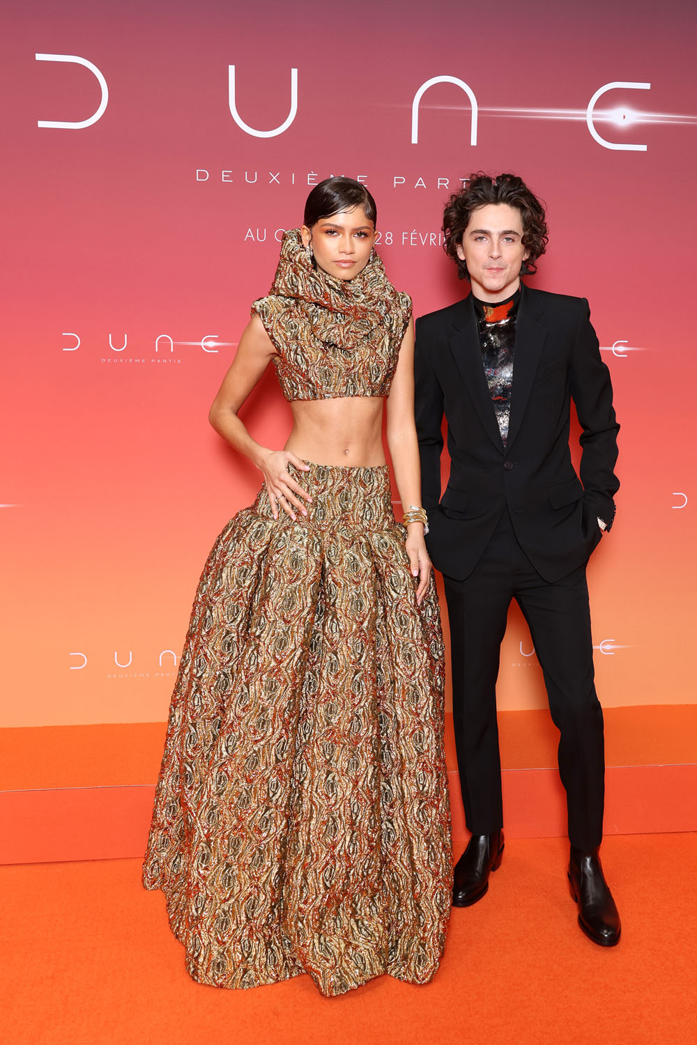 But that was the photo call – on the carpet it was custom Louis Vuitton. We’re getting dessert tones here, another exposed midriff, but the bunched collar evokes her character, Chani, and her people, the Fremen: