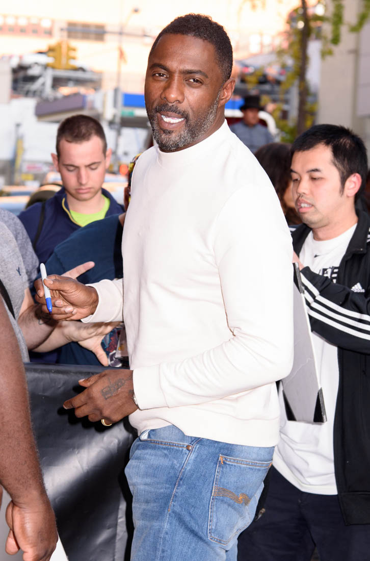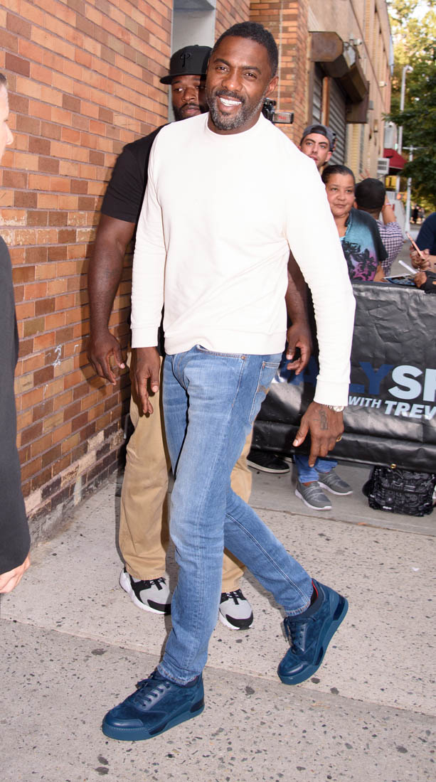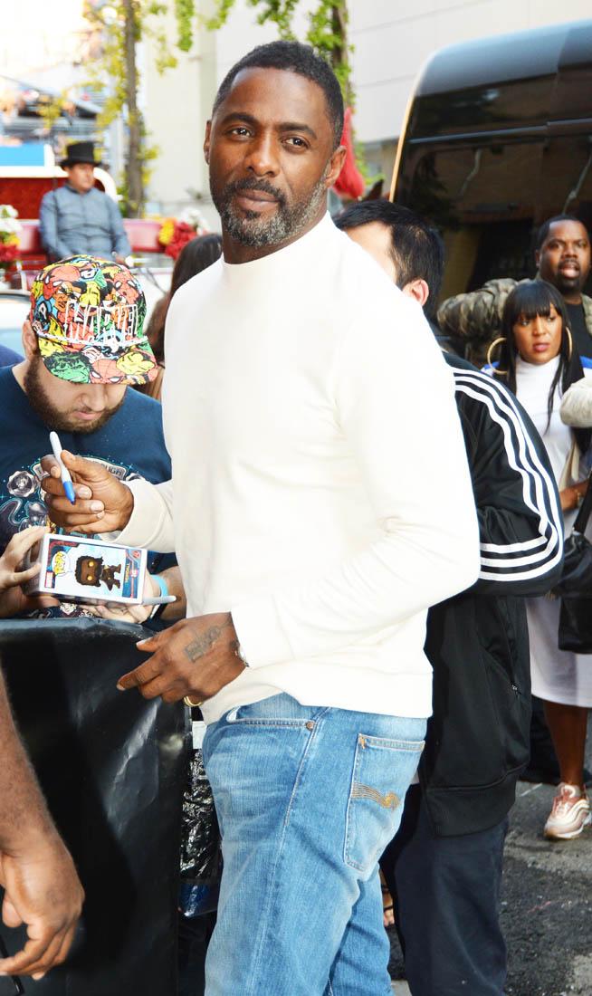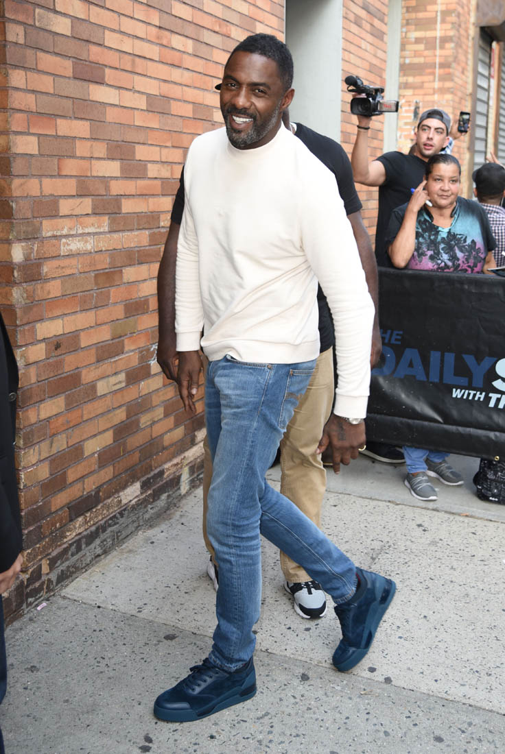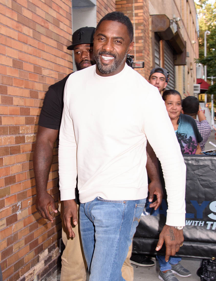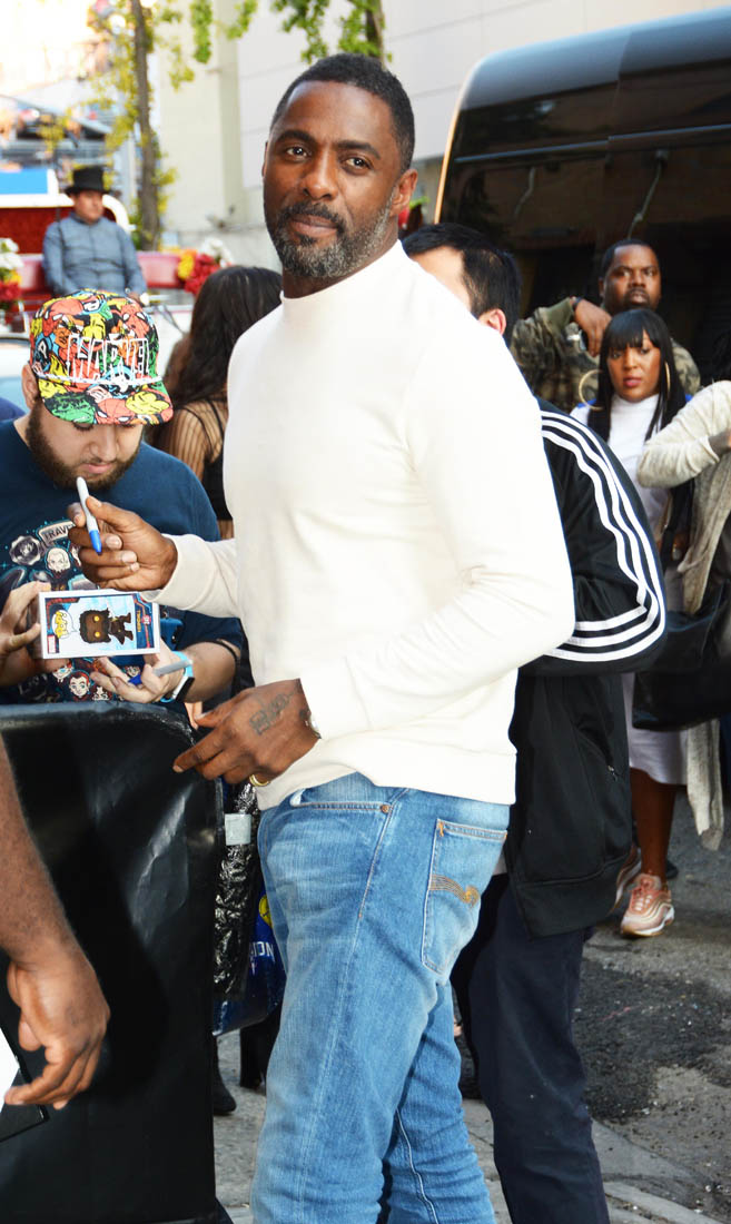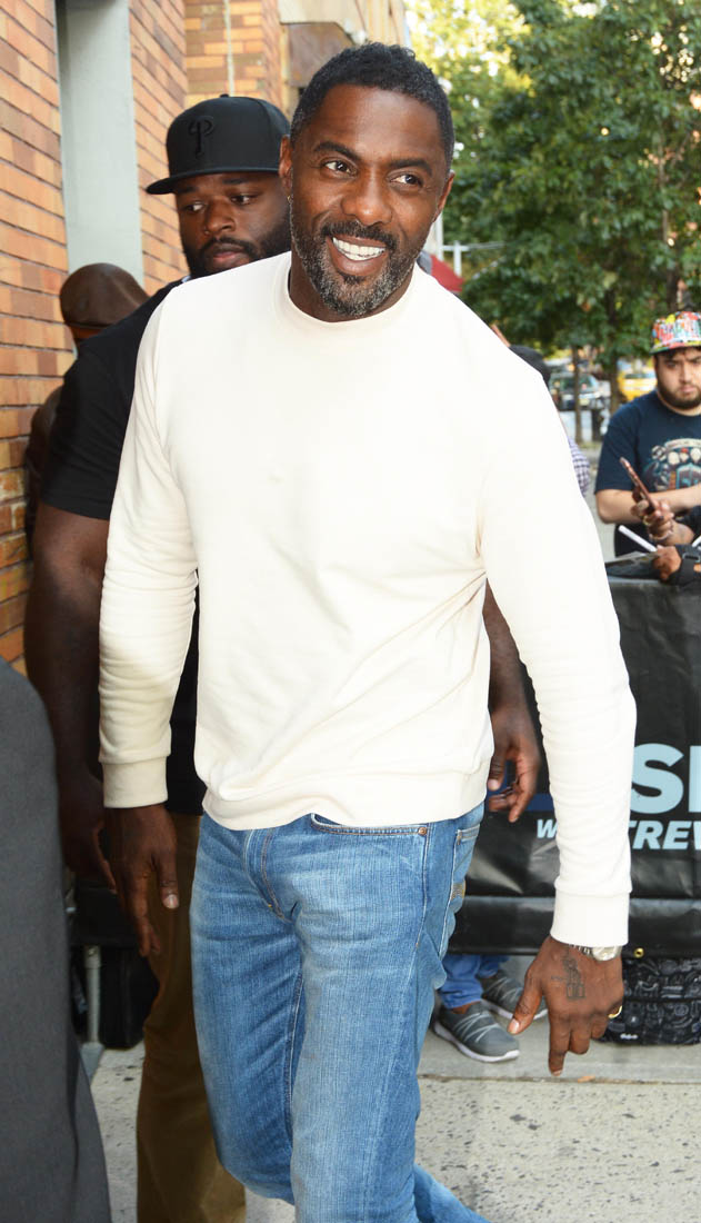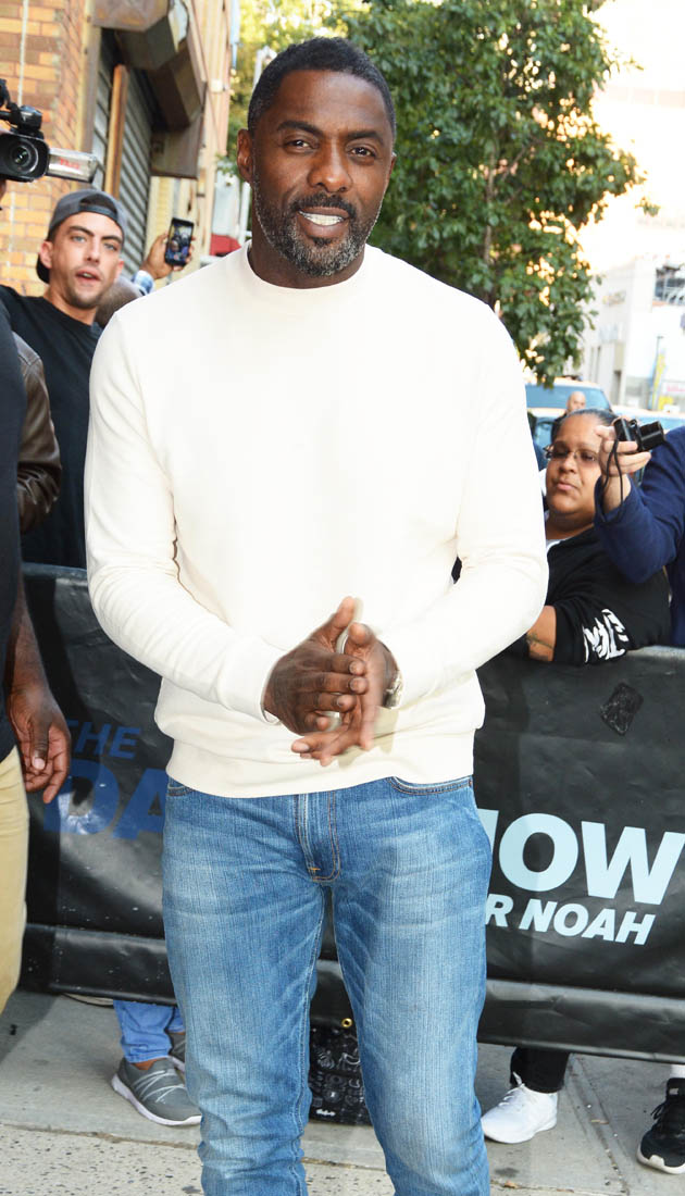 After promoting two films at TIFF this weekend and introducing us to his “girlfriend” Sabrina, Idris Elba was in New York yesterday, photographed outside The Daily Show with Trevor Noah. The Mountain Between Us opens on October 6th. So he’s promoting it beyond the festivals now, trying to generate interest for a film that didn’t seem to generate much interest here in Toronto. Reviews, so far, have been medium. No one loves it. No one hates it. And I feel like both Idris and Kate Winslet have other projects with more potential. Kate’s in Woody Allen’s Wonder Wheel, due in December, award season, and that’s what most people are waiting on to see if there might be yet another nomination to her name. For Idris, he has two major releases in November – Thor: Ragnarok which will take over the box office and Molly’s Game which, following its world premiere at TIFF, has now entered the Oscar race as a possibility on the strength of Jessica Chastain’s performance and, also, her chemistry with Idris. (Sarah reviewed Molly’s Game yesterday) He too is now on the long list for a possible Best Supporting Actor nomination. Long list. I wonder though what his presence on the campaign circuit will be though. The last time we talked about Idris and Oscar it was for Beasts Of No Nation and it ended up being one of the biggest snubs of that year. That Best Supporting category is probably where you have to campaign the least. Mark Rylance won a couple of years ago without participating at all in the process. I could see the same happening this year, maybe not with Idris but with Mark Rylance again or Michael Stuhlbarg (Call Me By Your Name) or Sam Rockwell.