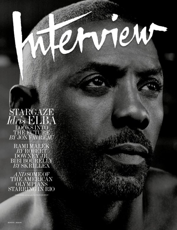 It’s Idris Elba. On the cover of Interview Magazine. I’m guessing ahead of the release Star Trek Beyond, in conversation with Jon Favreau. The photos are in black and white. And you don’t need them to be in colour when…well… when Idris has his shirt of. Or is posing in ankle length pants with his leg up. This shot? Please. I’ll leave you alone now.