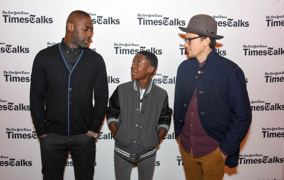 Idris Elba is in New York. Check him out, fine as f-ck, walking around in a red beanie yesterday. Earlier this week, Idris, Abraham Attah, and Cary Fukunaga were promoting Beasts Of No Nation at TimesTalks. Netflix is doing whatever they can to make these nominations happen.