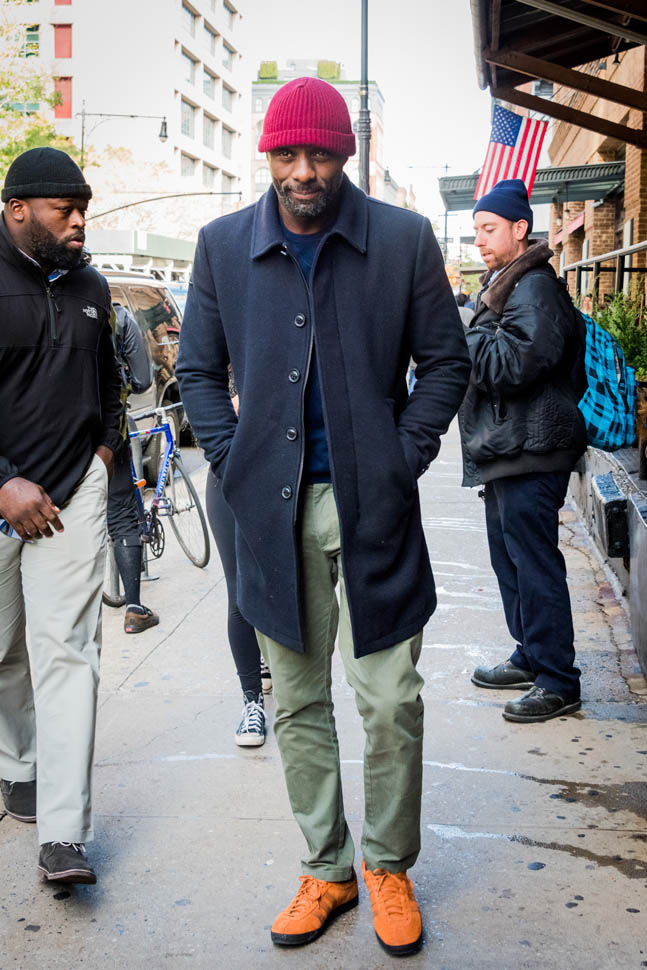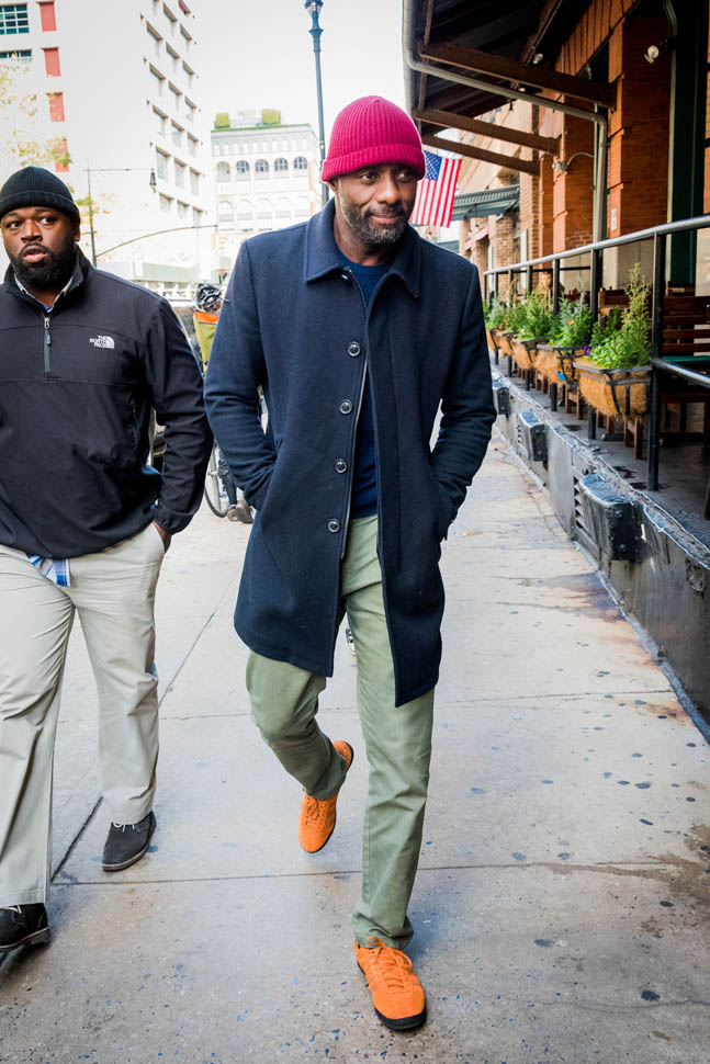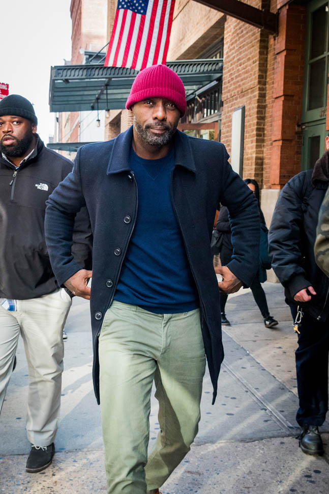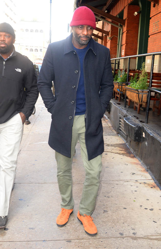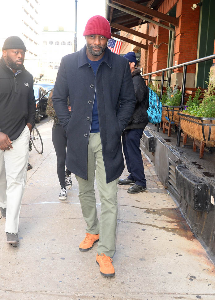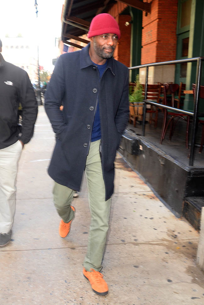 Idris Elba is in New York. Check him out, fine as f-ck, walking around in a red beanie yesterday. Earlier this week, Idris, Abraham Attah, and Cary Fukunaga were promoting Beasts Of No Nation at TimesTalks. Netflix is doing whatever they can to make these nominations happen.