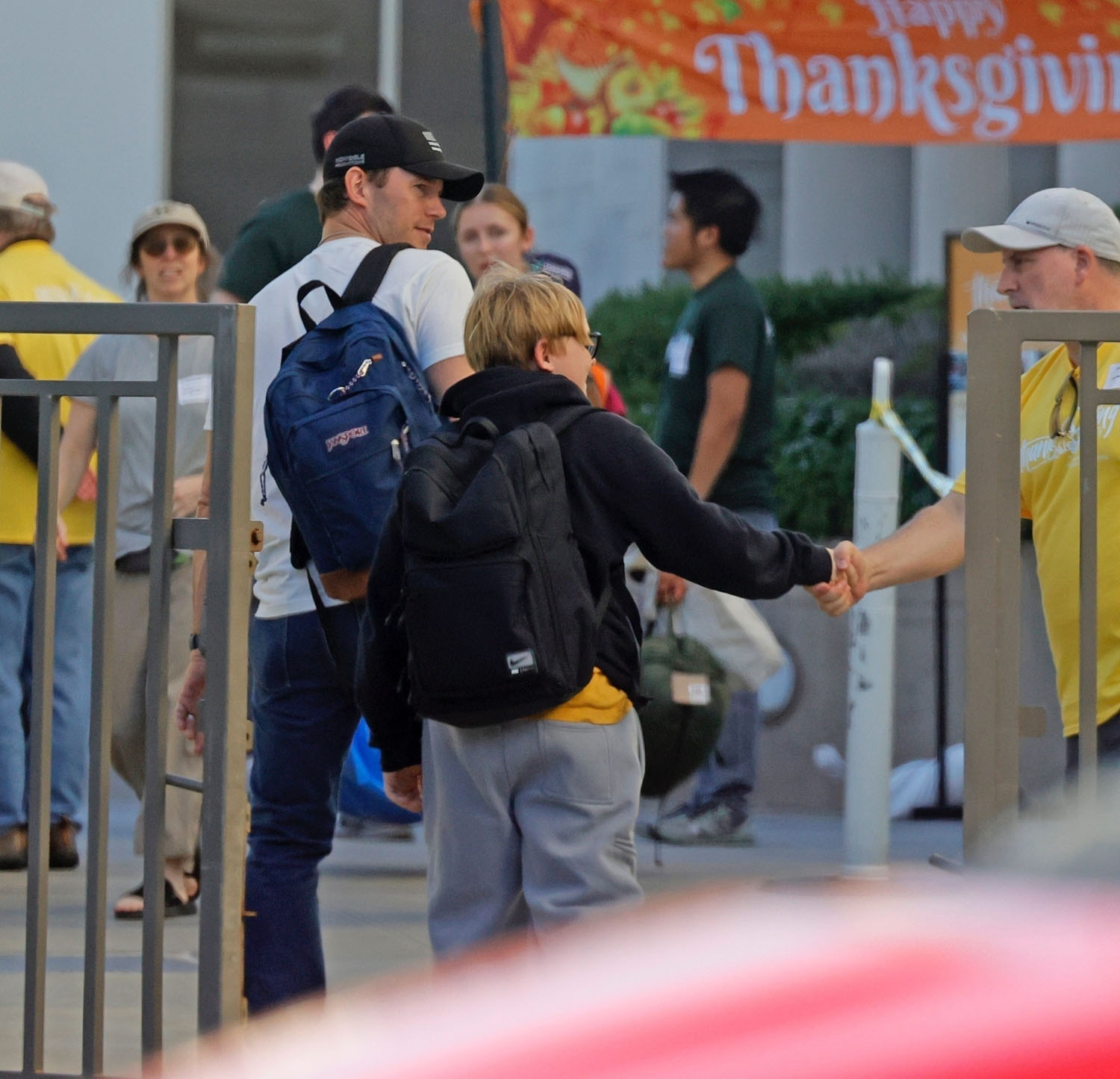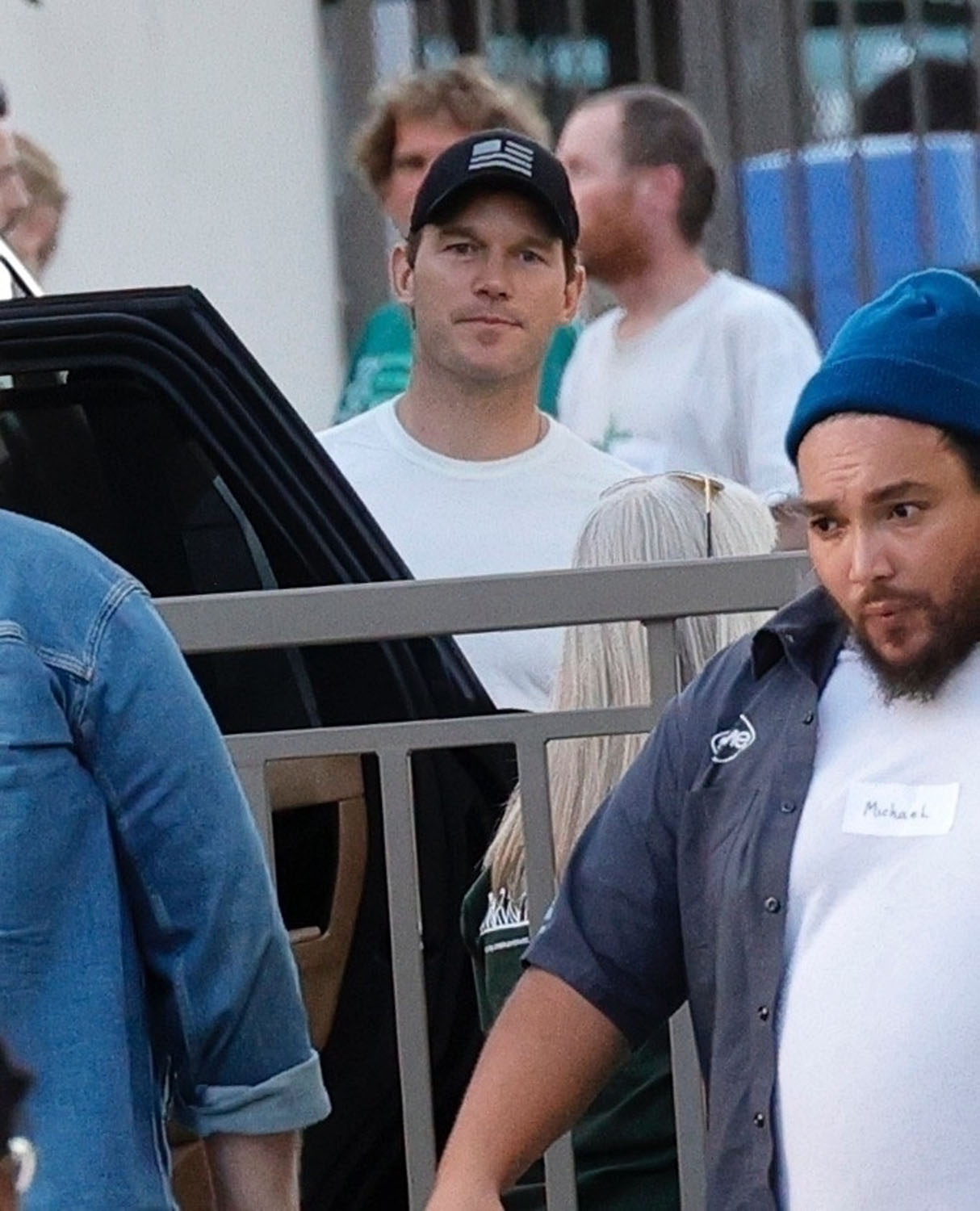 Attached - Chris Pratt with ex Anna Faris, current wife Katherine Schwarzenegger, and son Jack yesterday in LA.