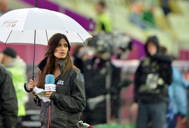 The tournament is a week old. How could I have waited so long to post photos of my favourites? Sara Carbonero gets to work at Euro 2012 (as a sports reporter) AND support her man, Iker Casillas who totally saved Spain’s ass against Italy last Sunday. Am attaching a few shots of the two this week. Spain doesn’t play again until Monday. Hopefully there will be some new images of them on the weekend then.