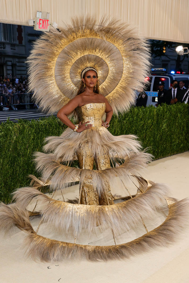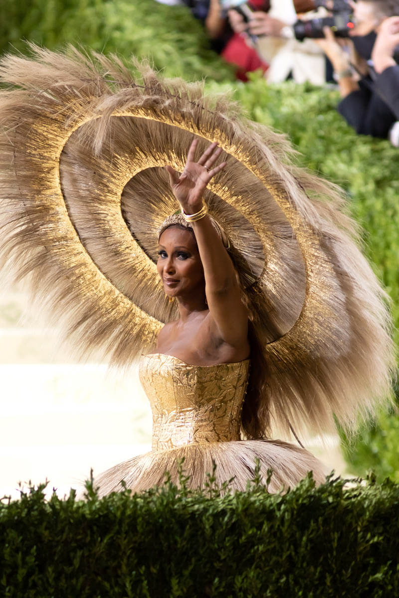 We start then where we should, with Iman in Harris Reed who is British American and who describes their brand as “romantic gone nonbinary”. Iman’s costume is inspired by American ballroom and it is a spectacle, a spectacle that only an icon like Iman could pull off. This is 100% how you nail a theme – a debutante for modern times, and you can see a clear connection in this outfit between the southern belle cotillion and drag ball culture, especially in that headpiece, which is both Scarlett O’Hara and Scarlet Envy, or Scarlett Bobo if you’re in Canada. If you know, you know.