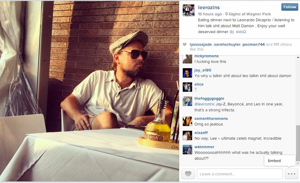 Maybe Leo thinks Matt is square. Maybe Leo thinks Matt is overrated. Maybe Leo thinks Matt is a dumbass for not picking his wife from the Victoria’s Secret catalogue. Maybe it’s all bullsh-t and this Instagram person is lying. Or, maybe, they, um, had something in common. Some similar experience and/or experimentation. Maybe one time they got drunk and shared a Cuban cigar. Maybe it’s nothing.