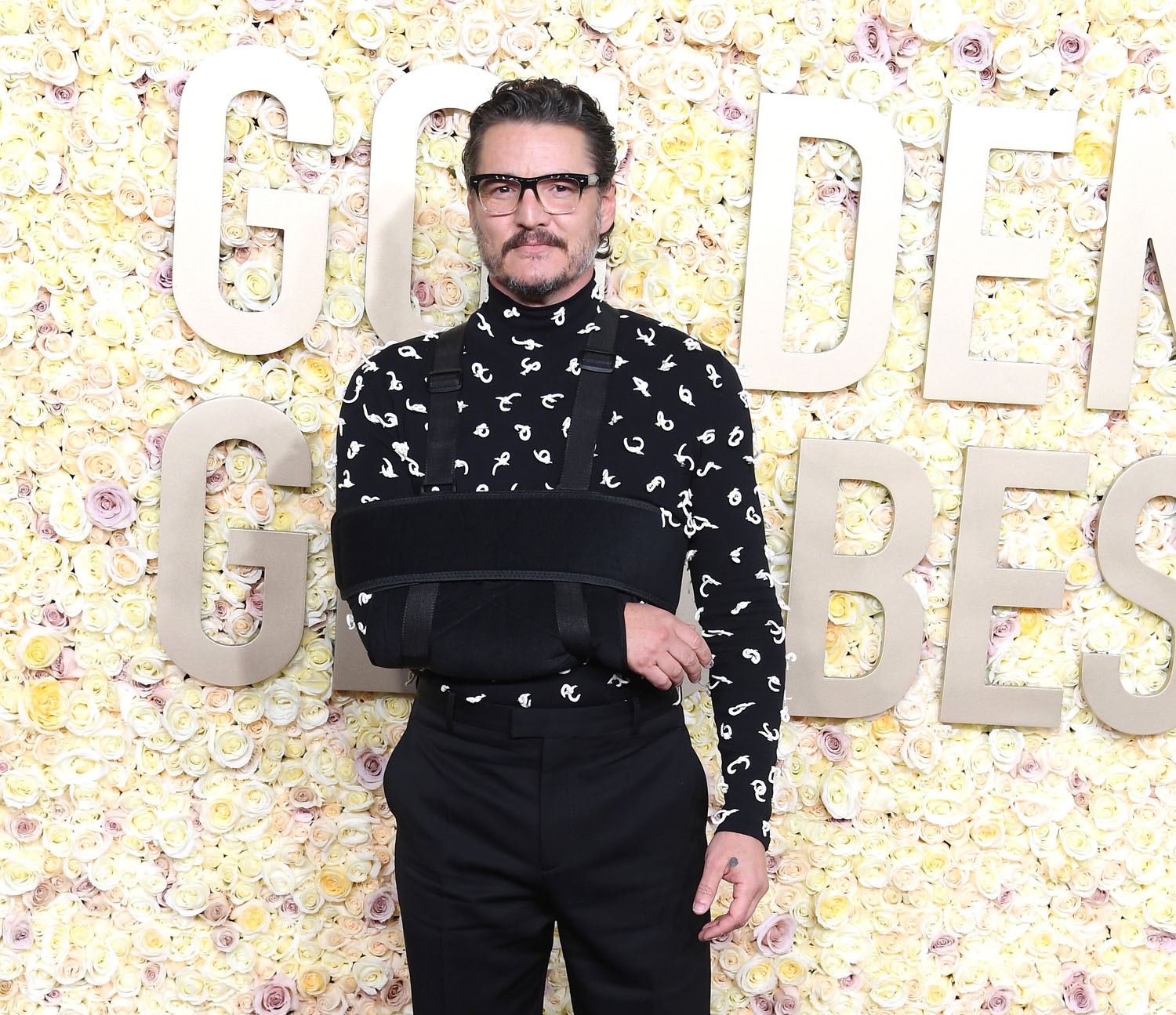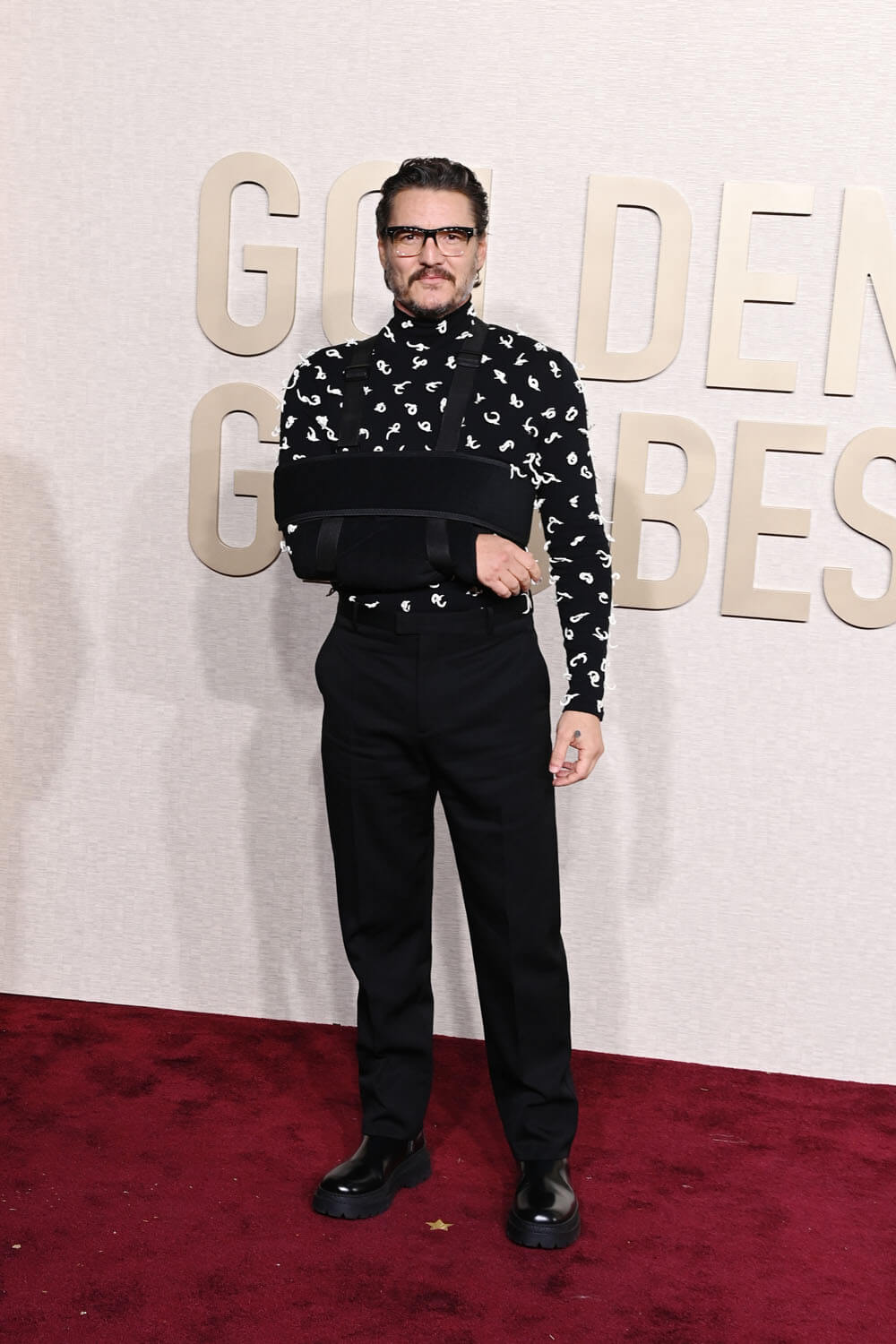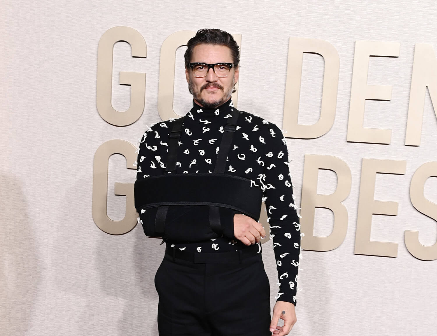 We’ll start with generational daddy, Pedro Pascal who showed up in an arm sling after sustaining a fall. IN A TURTLENECK, black with printed white knots, and this is why he’s inspired all this devotion. Imagine having a broken arm, and still being this committed to the look that you are willing to wrangle your injured limb into one of fashion’s trickiest items? Getting into a turtleneck can be a workout, even when all your bones are intact! And here he is, so f-cking accommating, because he knew that TikTok would be waiting. We serve a benevolent king.