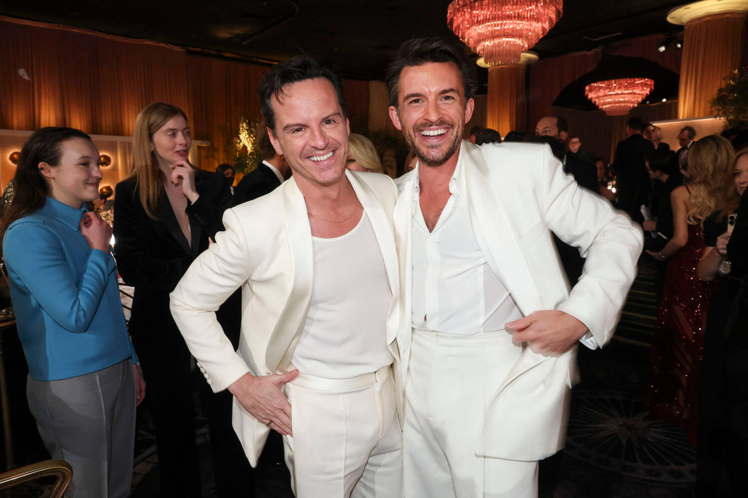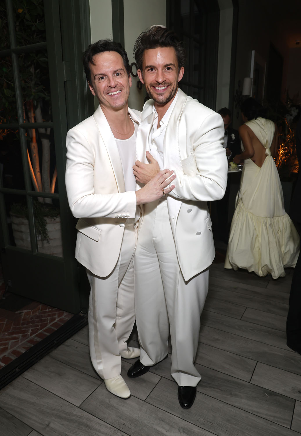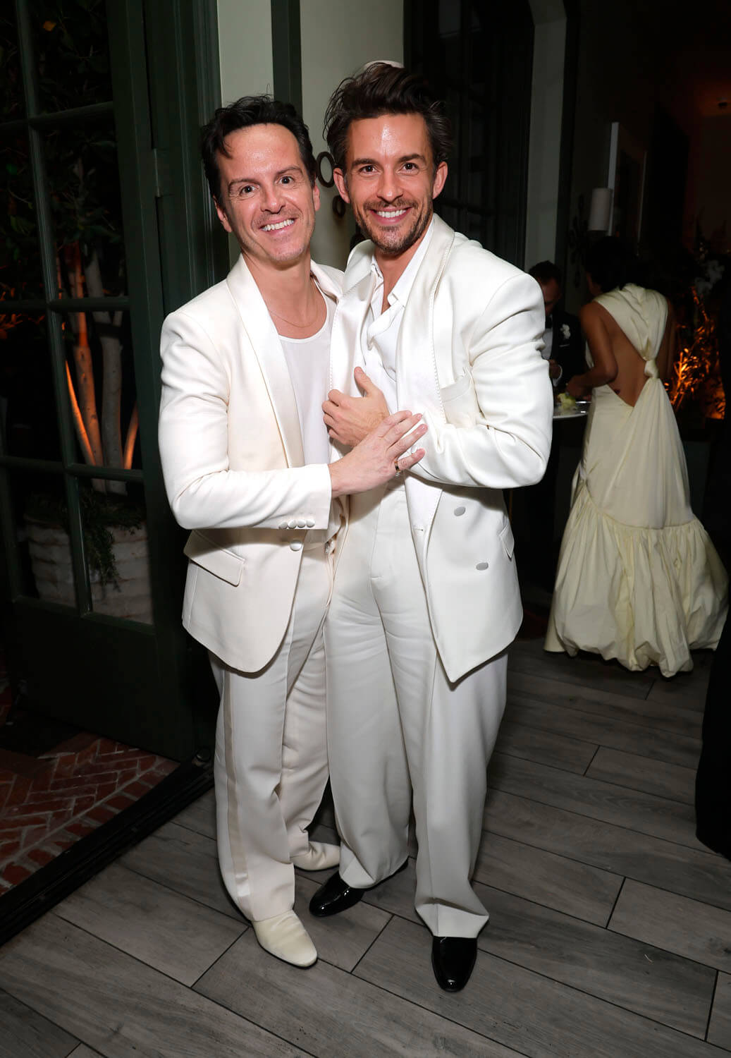 But then Andrew, in all white, with Jonathan Bailey, also in all white.