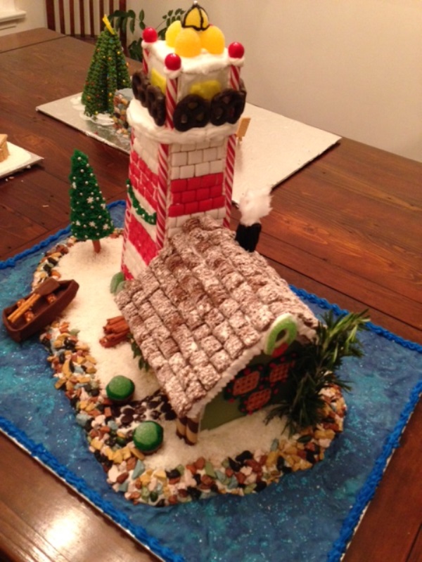 2."Christmas On The Coast": A lighthouse and the keeper's cottage are decorated for Christmas in. The lighthouse is covered in cinnamon and spearmint gum. A fondant ocean in multiple shades of blue laps at a candy coated chocolate shore. A fondant rowboat with pretzel oars is parked near a cinnamon stick log pile.