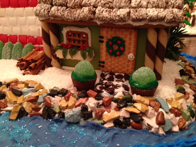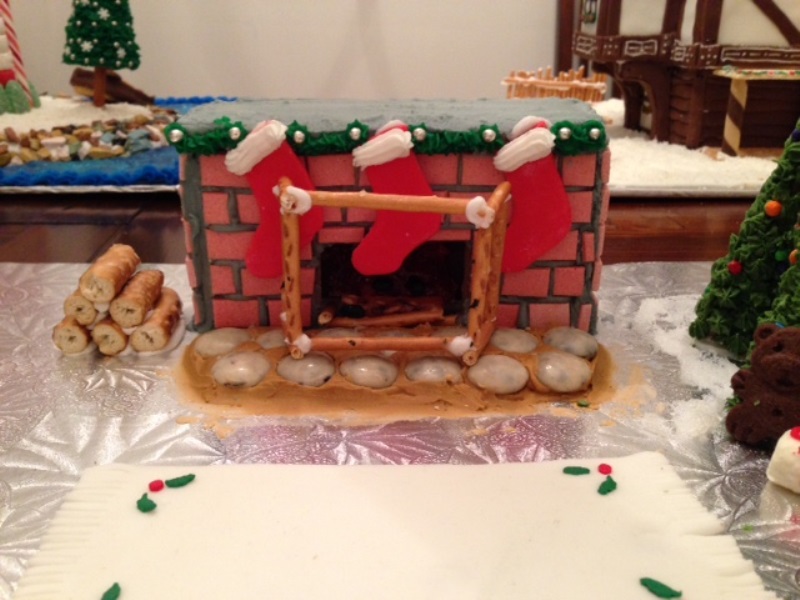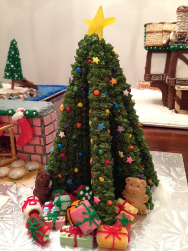 The gingerbread houses were built last night in a live competition. Everyone started off with the same store-bought kit. Using multiples kits is allowed. But everything you see (except for the cardboard base) must be EDIBLE and created on site. Like you can’t pre-order marzipan stockings or trees and bring them in. All details were created ON SITE. Here are the contenders of 2013: