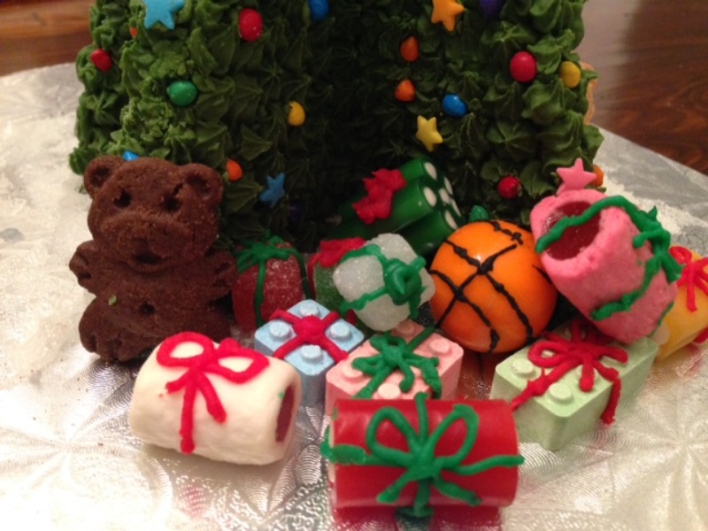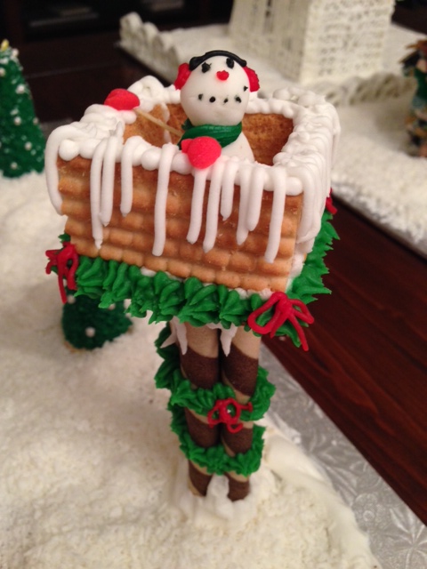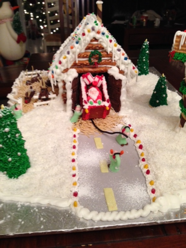 5."Santa's Cleared For Takeoff": Santa's elves are hard at work. Fondant elves, control-tower snowman, reindeer and the Big Guy himself surround this pretzel-log cabin. The reindeer's antlers are made of dried pasta, as is the "hay" under Santa's cookie and fondant sleigh, which the elves struggle to pull out with some licorice rope. The reindeer have an easier time, relaxing in their Popeye candy stick enclosure, and enjoying a drink from their candy-sprinkle trough.