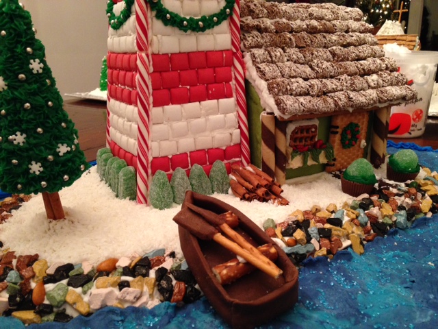 2."Christmas On The Coast": A lighthouse and the keeper's cottage are decorated for Christmas in. The lighthouse is covered in cinnamon and spearmint gum. A fondant ocean in multiple shades of blue laps at a candy coated chocolate shore. A fondant rowboat with pretzel oars is parked near a cinnamon stick log pile.