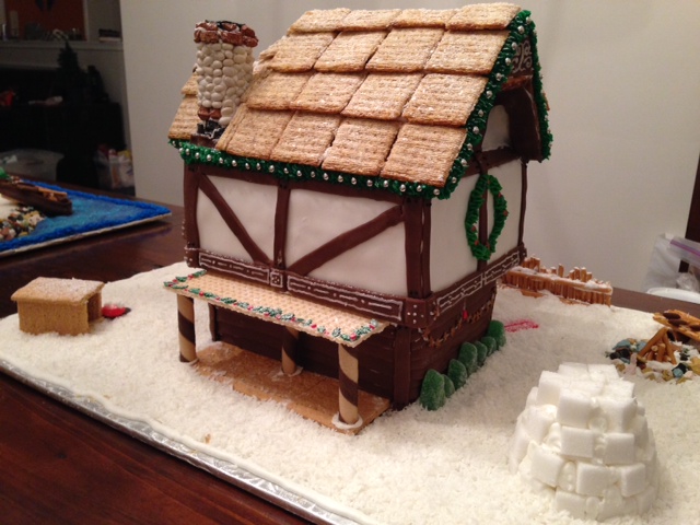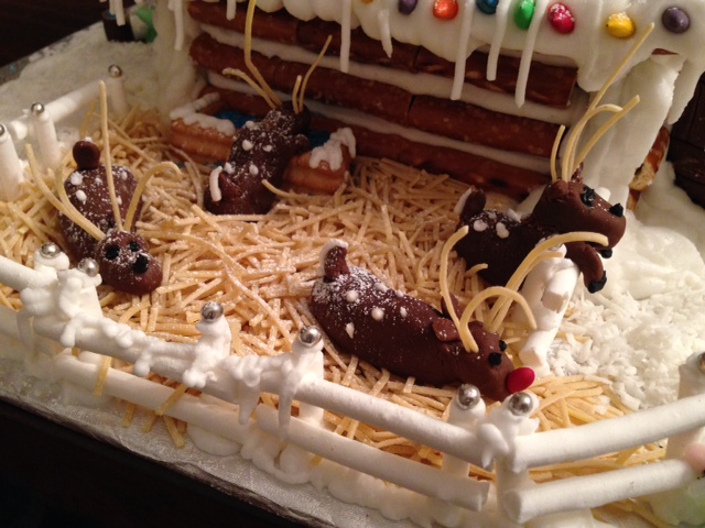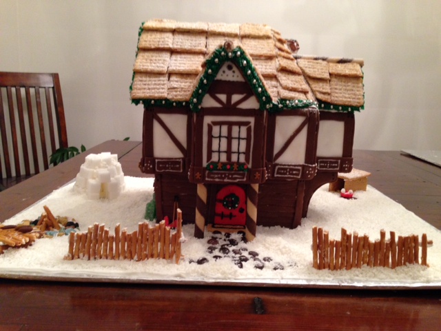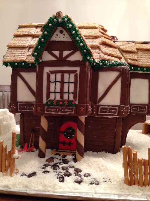 3.“The Christmas Cottage”: Multiple store-bought gingerbread house kits used to achieve a festive two storey cottage. White and chocolate rolled fondant was used for the Tudor style beams. A tiny pair of skis and spaghetti ski poles lean against the house. Zoom in to see the tiny piping details and decoration on the beams.