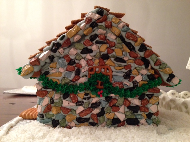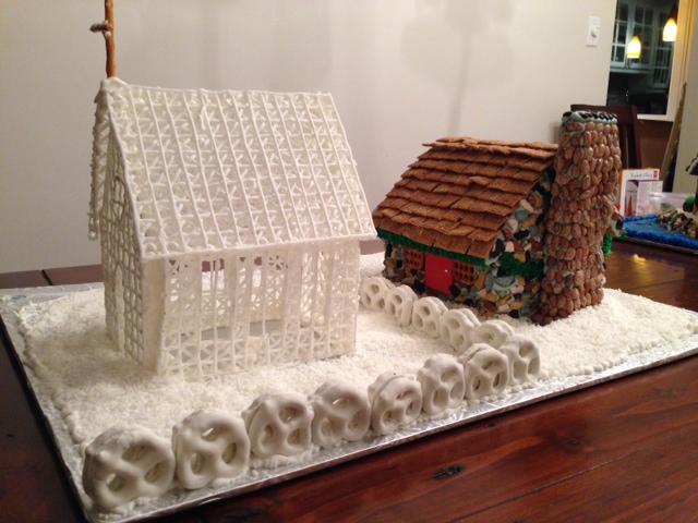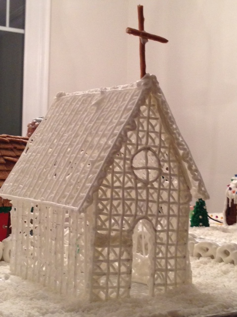 4."Oh Come All Ye Faithful": A church and neighbouring stone cottage are featured. The church is made completely of piped royal icing, giving it the effect of being made of lace. The icing was piped onto parchment paper and allowed to dry, then the pieces were assembled (gently!) to construct the church. The fence is made of yogurt covered pretzels. The cottage is covered in candy coated chocolate "stones", and the chimney is covered in dried beans.