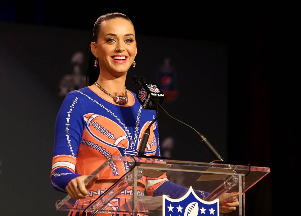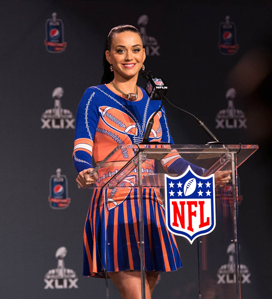 The Super Bowl is on Sunday. It’s a football game. Katy Perry thought you might be confused about that so this is what she wore at the press conference yesterday. Also, when does Katy Perry turn down an opportunity to use breast imagery? Cupcakes, pigskin, whatever works.