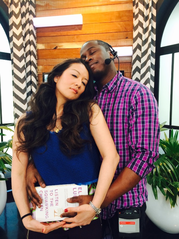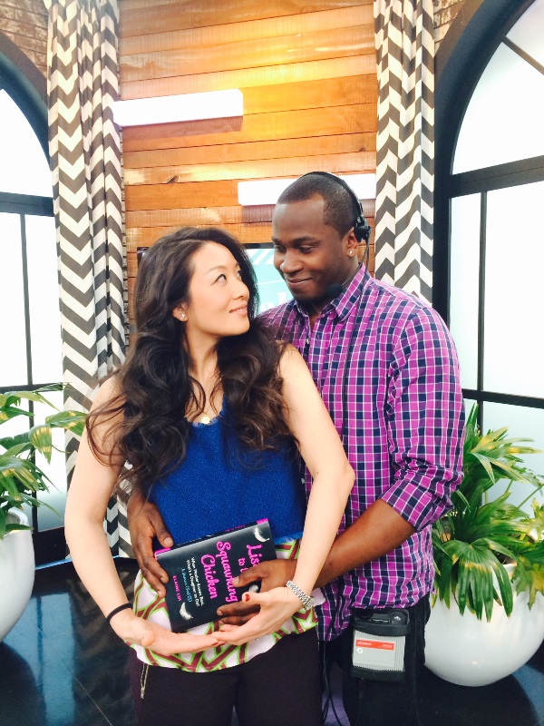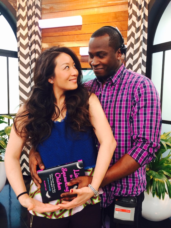 It’s a beautiful thing, carrying these words inside of me, truly feeling like WOMAN, W-O-M-A-N, for the very first time. So I couldn’t help myself. I had to close my eyes, I had to BE ONE with my child. I imagined us dancing in the rain and running after the rainbow. It’s not a true belly-cup however until a man reaches around and cups the bump with you. I shared this moment with Kwame, our floor director on The Social. And even though Kwame’s not the father of my book baby (my book baby is an immaculate conception), he too was swept up in the emotion. Cradling our book baby together, we shared the pride. We beamed at each other with the kind of closeness that can only be experienced when two people merge and create.