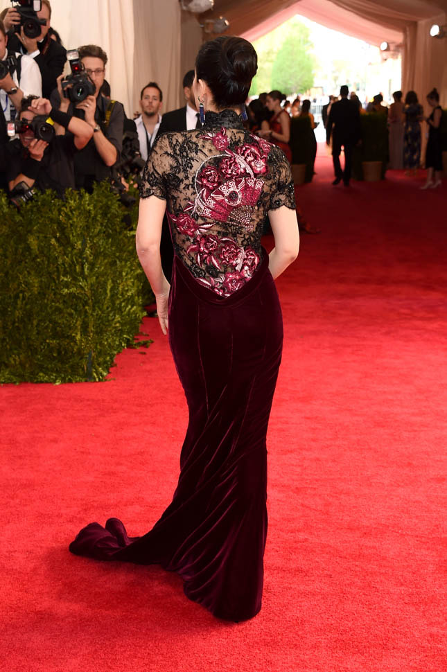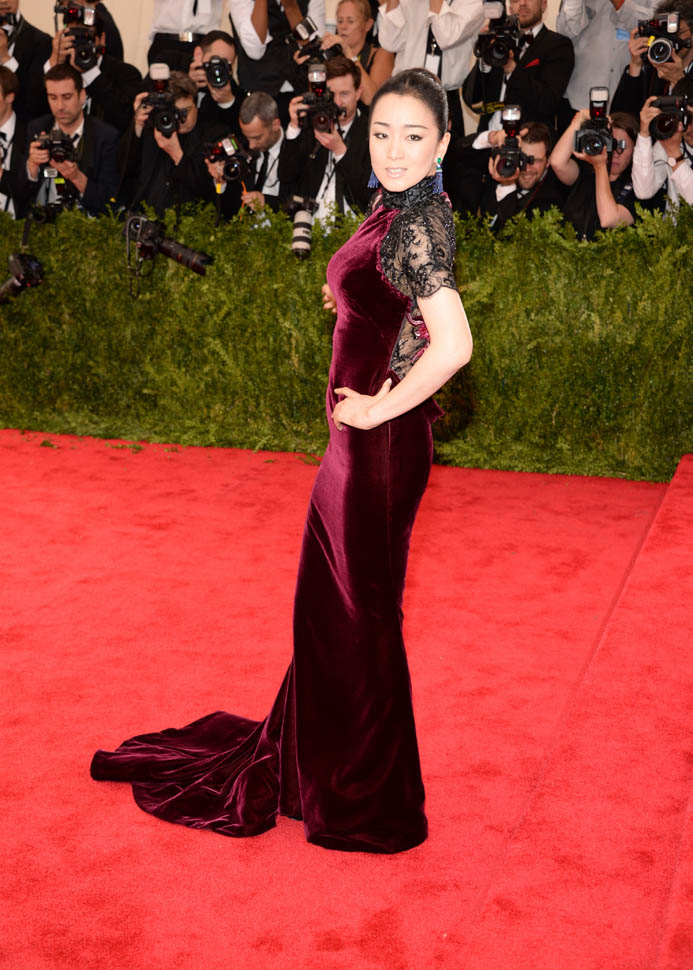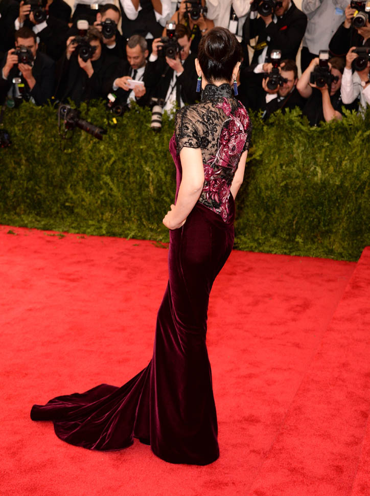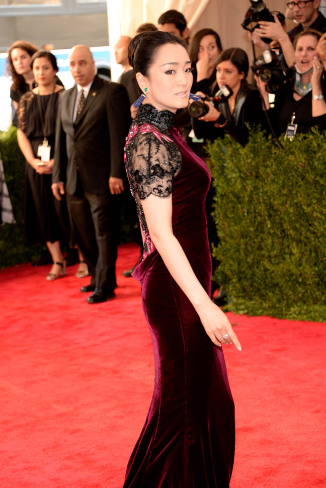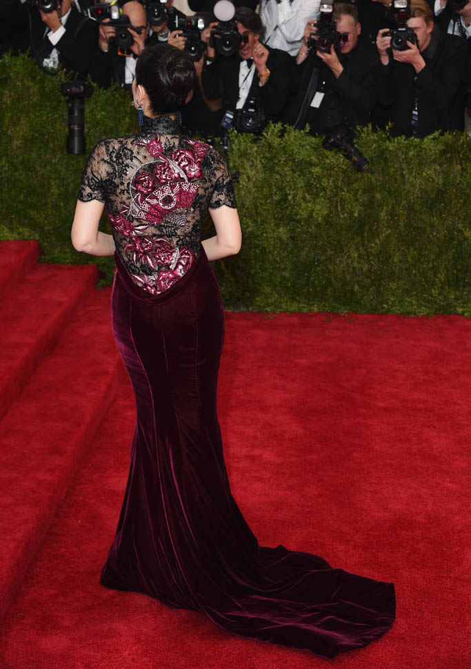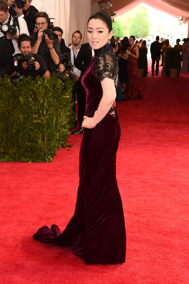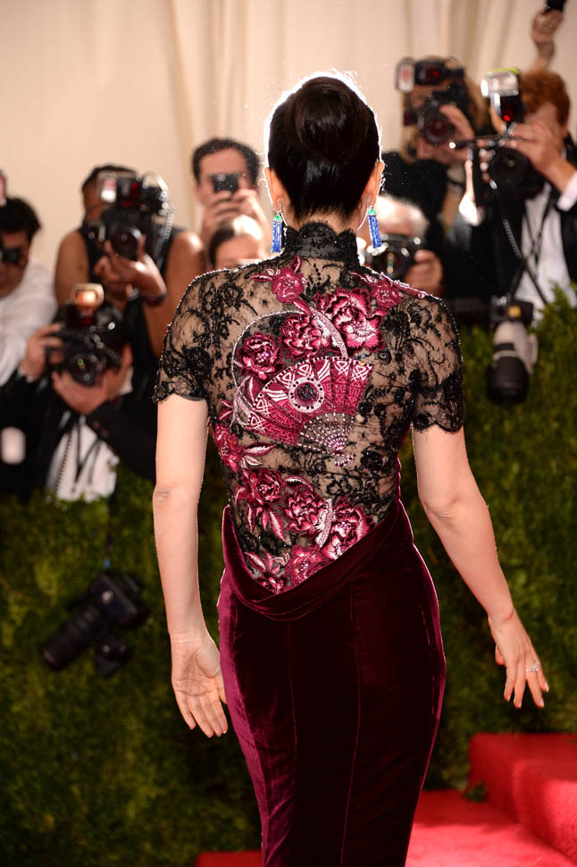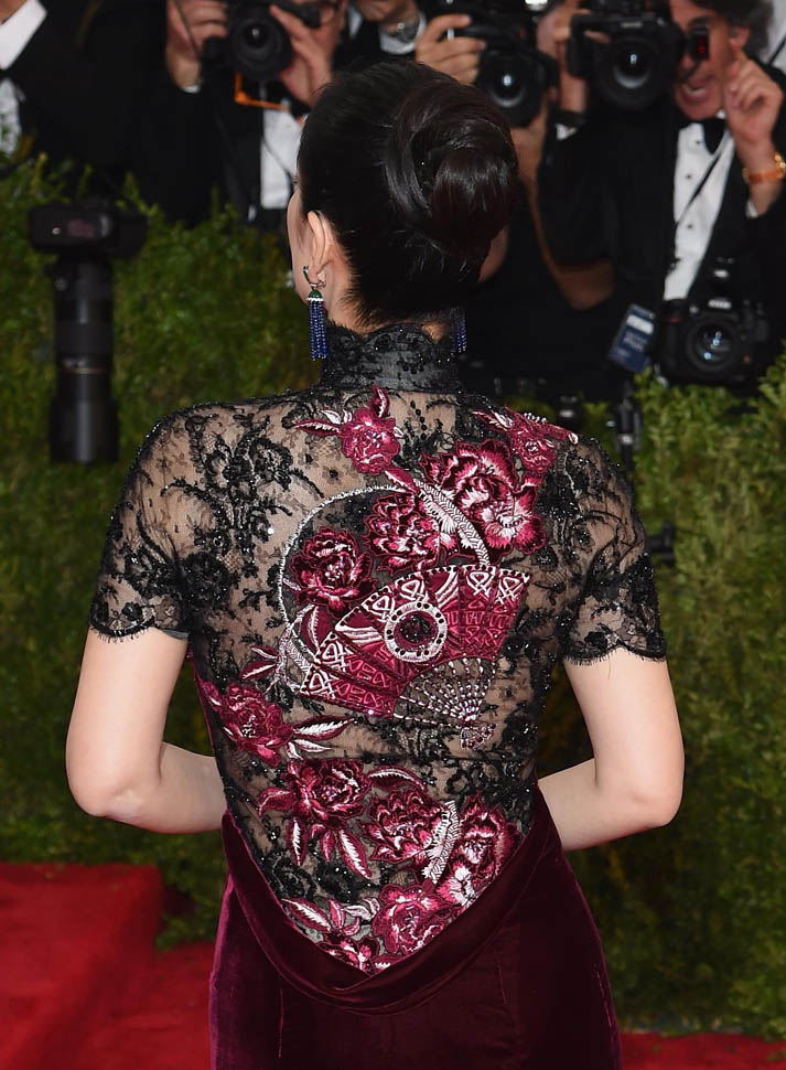 I’ll begin with Gong Li, one of the co-chairs of this year’s gala, and one of the finest Chinese actresses of all time. Look at the exquisite detail at the back and how the fan almost becomes the head of a goldfish. She’s perfect.