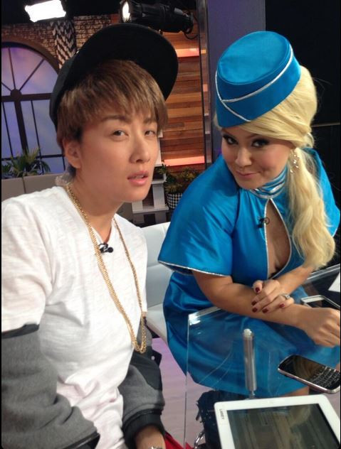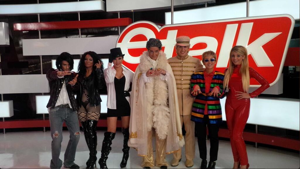 The Halloween theme on etalk yesterday was Vegas. From left to right, here we are: Devon Soltendieck as Criss Angel, Traci Melchor as Cher, Tanya Kim as Shania Twain, Ben Mulroney as Liberace Behind The Candelabra with Alex, our talent coordinator playing his Scott, me, and Danielle McGimsie as Britney Spears. To clarify, I was Elton John. But some people thought I was trying to be Psy. What I was really trying to be was a dude for a day. Because on The Social I became Justin Bieber.
