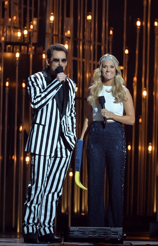 etalk sponsored the enRoute Film Festival Awards last night in Toronto, celebrating emerging talent in Canada, and I hosted the event to honour young filmmakers. Click here for more information about their work and the event. Since I hosted the presentation, I missed the Country Music Awards which I had such a great time watching last year, from start to finish (what’s up, Amy D?), because there’s a … looseness is the only word I can think of right now… to this show that’s missing from the other ones, even the Golden Globes. Is it because there’s a certain amount of “I don’t give a f-ck” that’s essential to the country spirit? In 2012, the CMAs happened just as Taylor Swift broke up with Conor Kennedy. (God, remember that?!) And Brad Paisley refused to kiss her ass about her love troubles. I wondered if he was allowed to be so irreverent this year. So far, from what I’ve seen so far… definitely not. At least not where Swift was concerned. Apparently the target has moved…onto Miley Cyrus. And Julianne Hough. I’ve attached the opening monologue here. All of Carrie Underwood’s other costume changes however will be getting their own post.