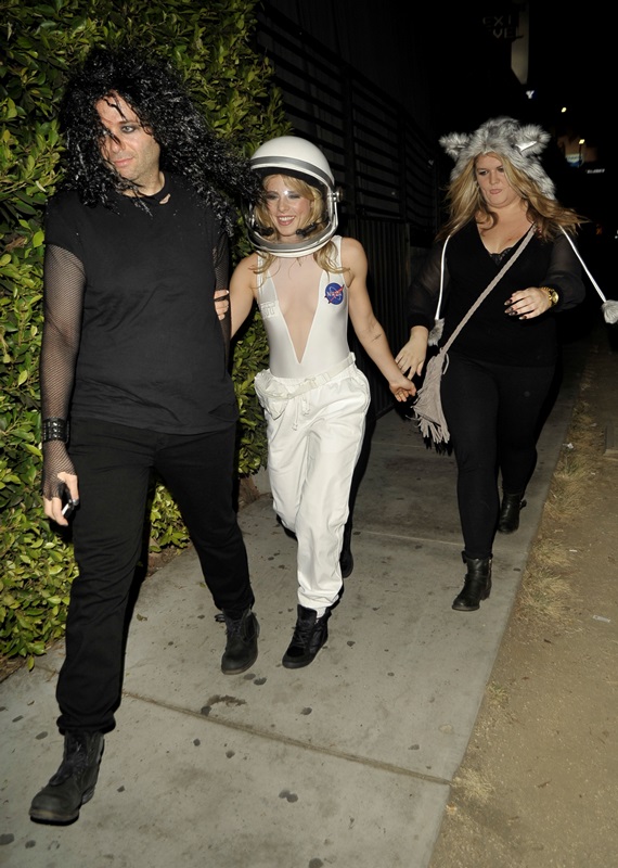 Like this woman, attached below, an actress I’ve never heard of called Emily Rickard, at least according to the paps, who went to Matthew Morrison’s party dressed up like an astronaut…with modifications. Space station bride?