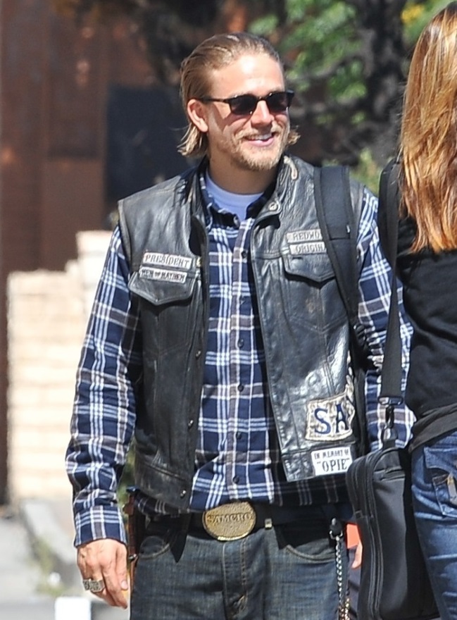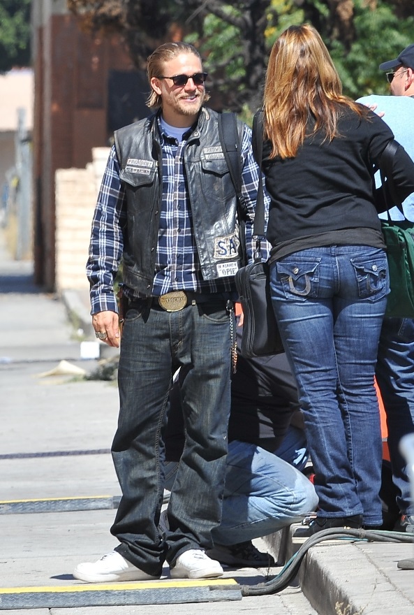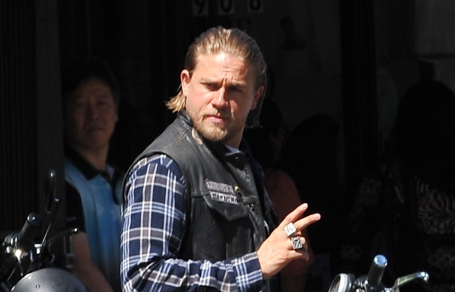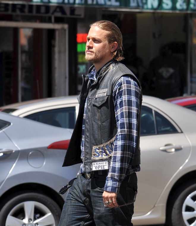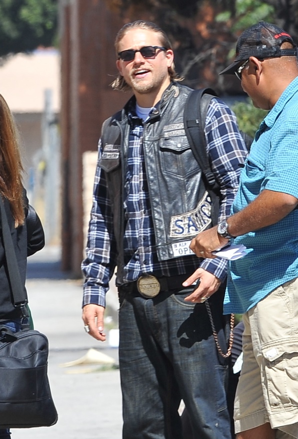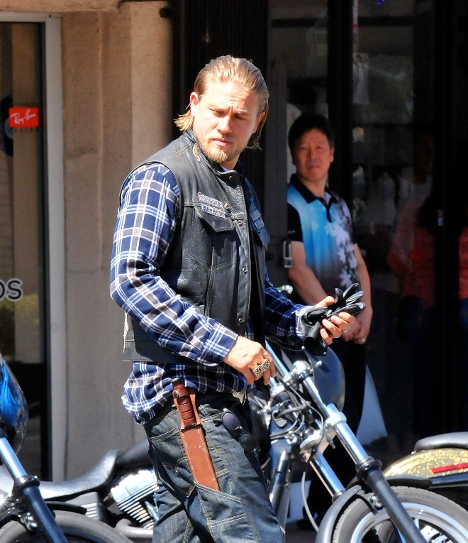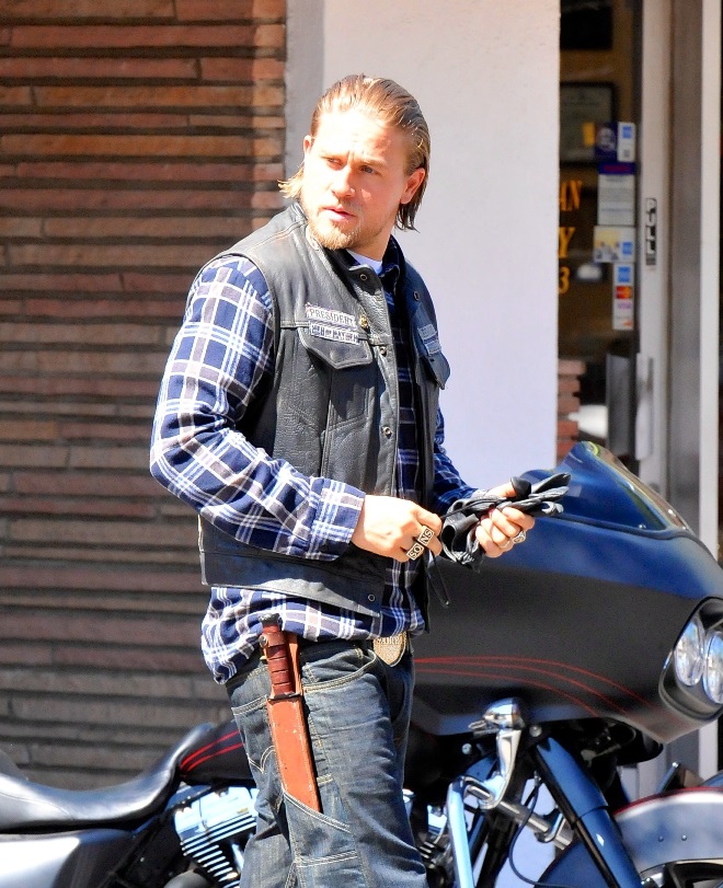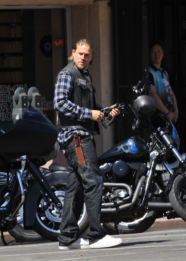 Here’s Charlie Hunnam on the set of Sons Of Anarchy yesterday. Before Monday’s Fifty Shades Of Grey announcement, Hunnam didn’t get papped on the regular. Well that’s about to change now.