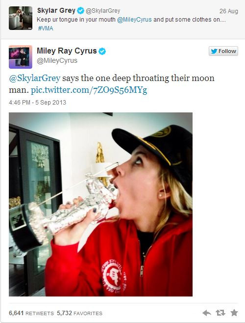 Yesterday Miley was Twitter-fighting a paparazzo and calling him a c-nt. You can see the tweet here. She also decided to throw down with Sklyer Gray, responding to a tweet from Gray on the night of the VMAs -- in other words, two weeks ago -- in which Gray told her to keep her tongue in her mouth.