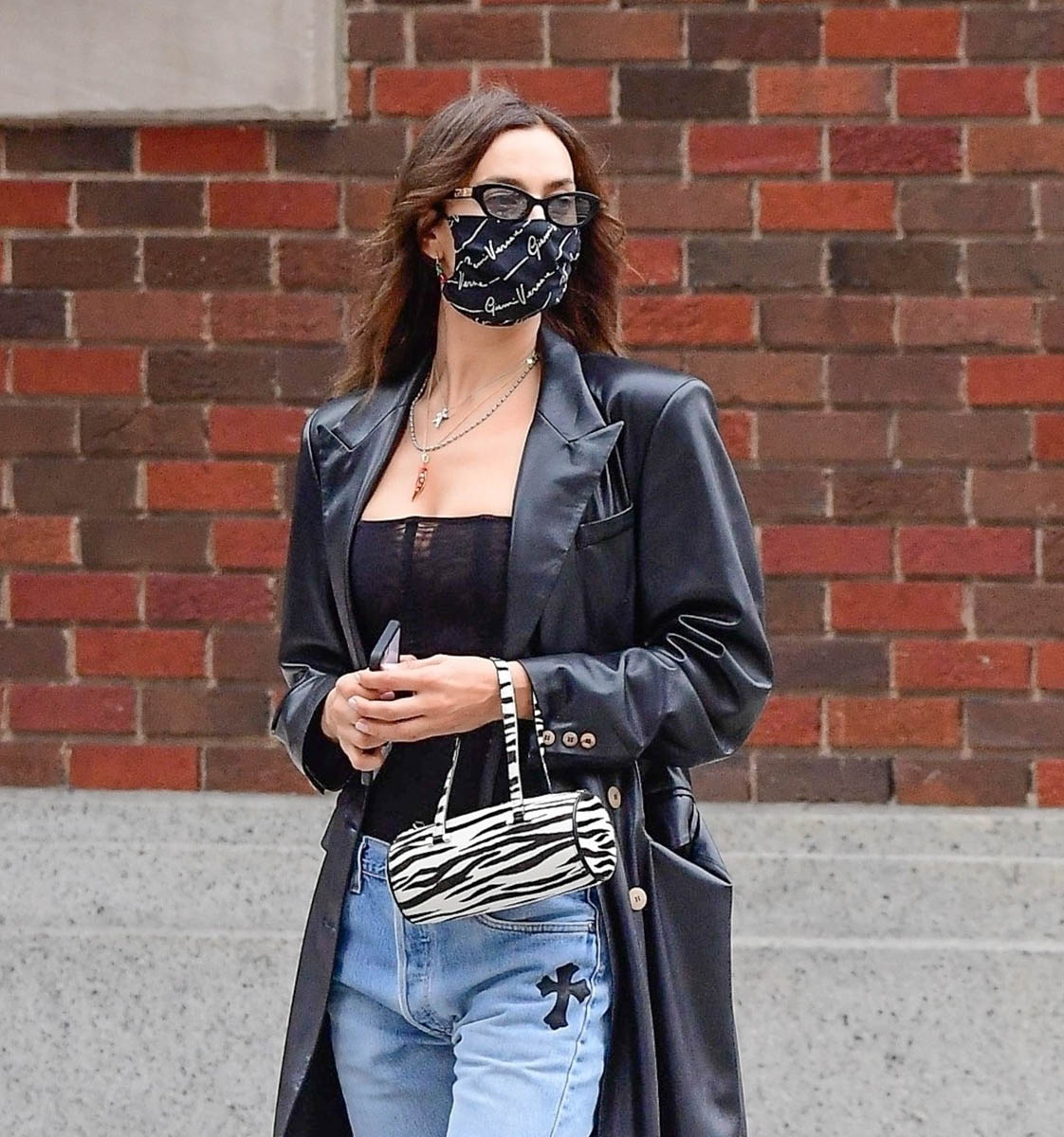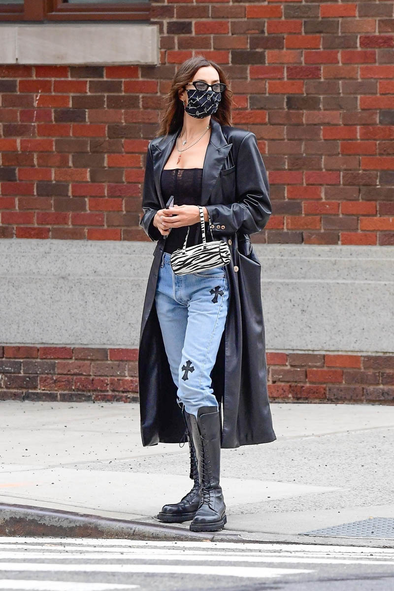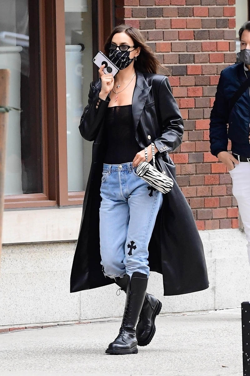 Earlier this week I linked to an outfit on Irina Shayk that, in spite of myself, I couldn’t help but want. This time it’s a definite pass. But I’m curious what she was vibing when she put this together. It’s a black leather trench coat, black knee-high combats, baggy jeans, and a corset style bodysuit. All of it put together, it’s almost like a costume from a spy movie. Mr and Mrs Smith comes to mind. (Go Fug Yourself)