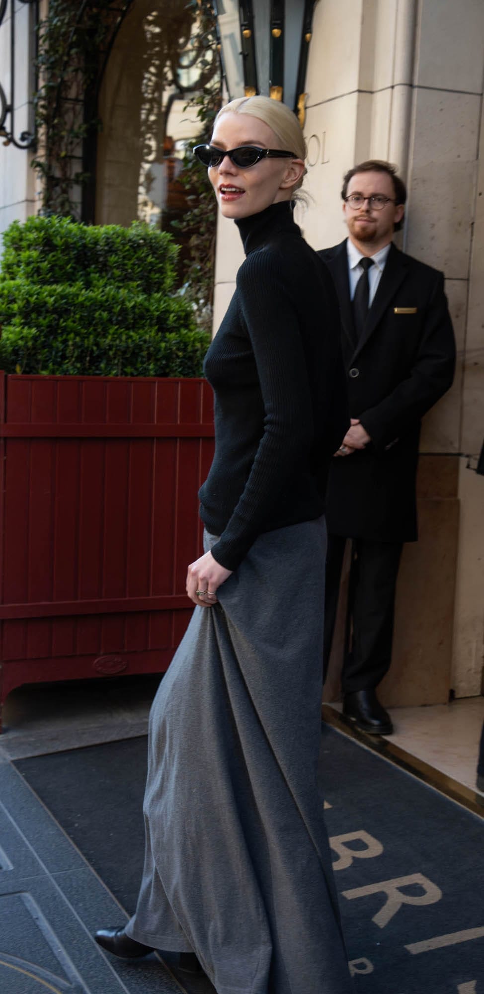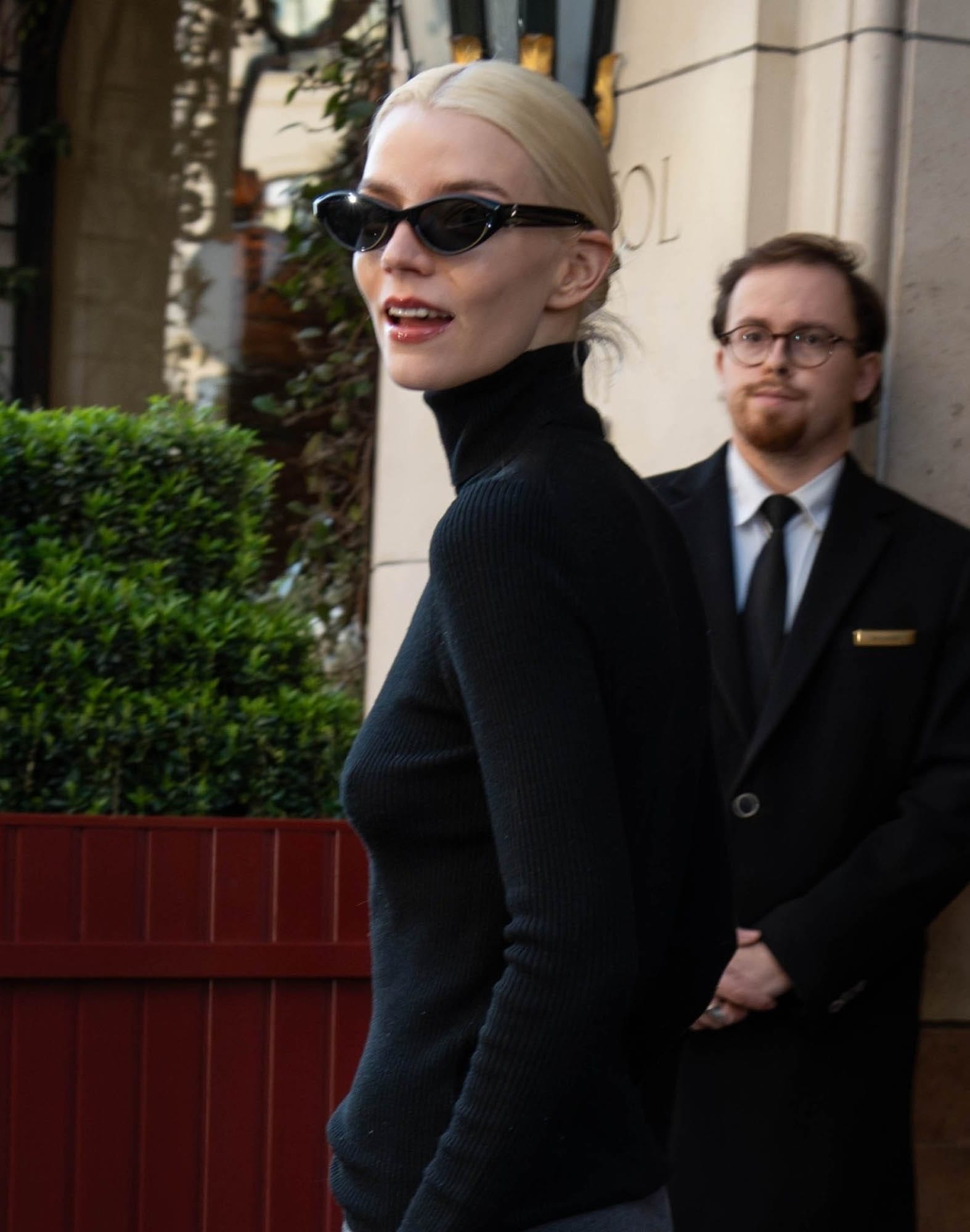She was also spotted in Paris yesterday in a black turtleneck and another sleek hairdo and the photos are noted as “Anya Taylor-Joy channels Carolyn Bessette Kennedy”.
