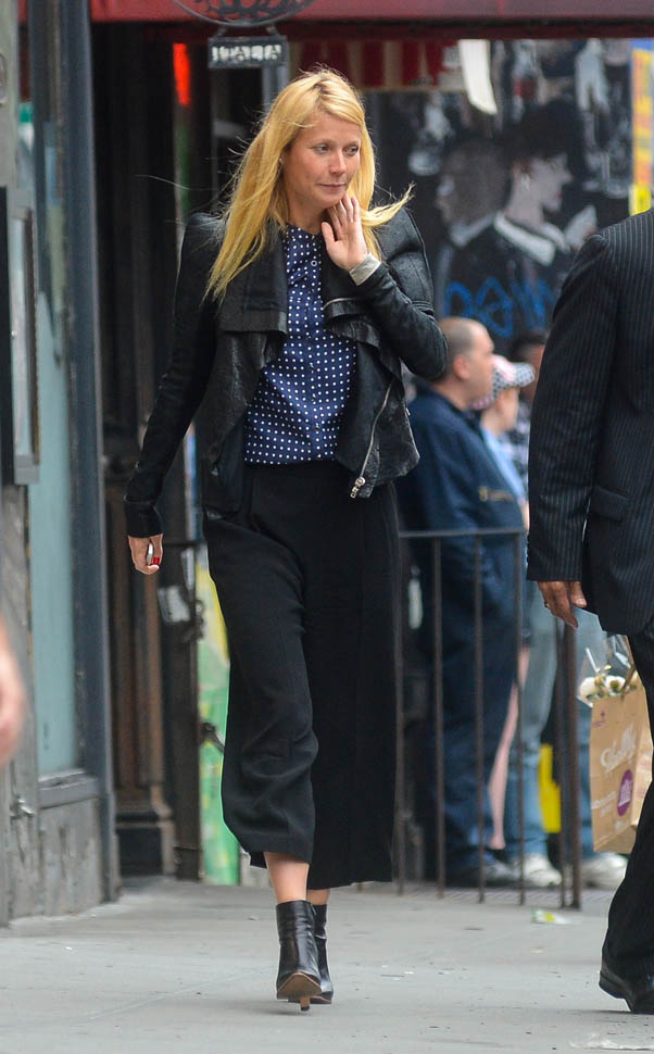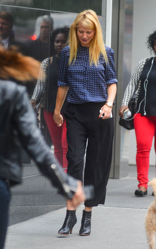 Here’s Gwyneth in New York yesterday in a great outfit, LOVE those pants, after shopping at Bloomingdales. A couple of my blonde friends have made comments recently about her tone. That her colourist needs to take down the yellow. Is this a true story?